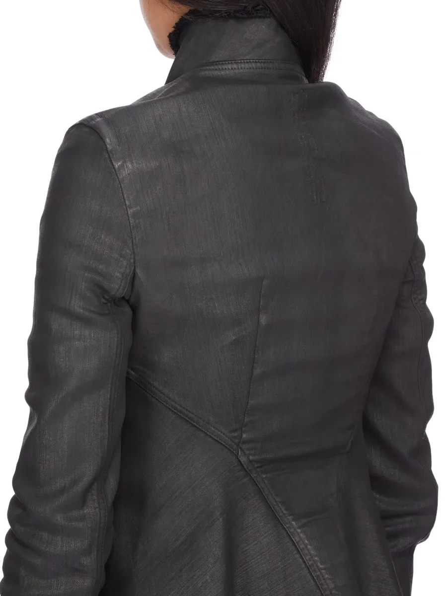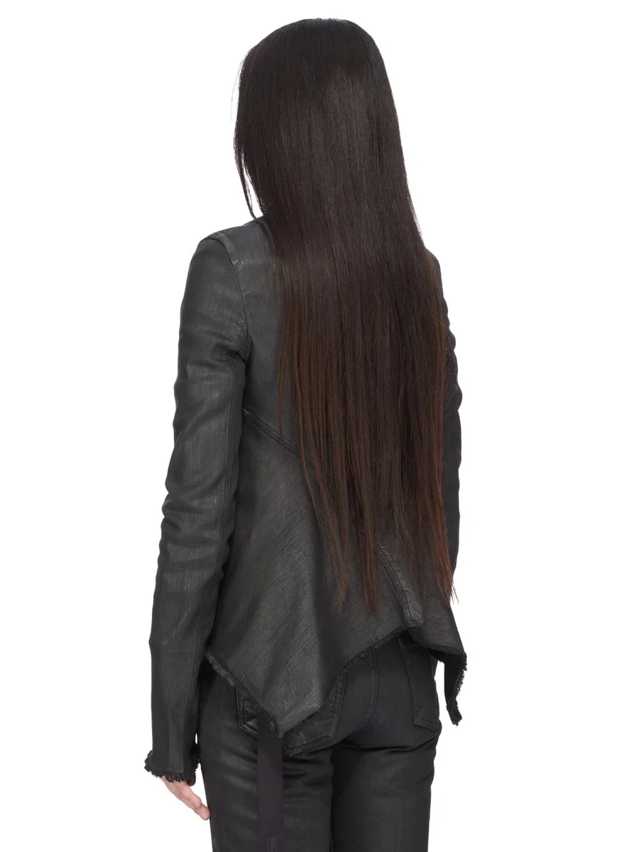 THIS NASKA GARY JACKET IS BELOW WAIST LENGTH WITH A SKIN TIGHT FIT. IT HAS LONG SLEEVES, A HIGH NECK WITH AN ASYMMETRICAL ZIP FRONT OPENING AND LEVEL SHOULDER SEAMS WITH TOPSTITCHING. IT FEATURES A CURVED NASKA HEMLINE THAT DIPS INTO TWO POINTS AT THE BACK AND HAS RAW CUT HEMS AND EDGES.