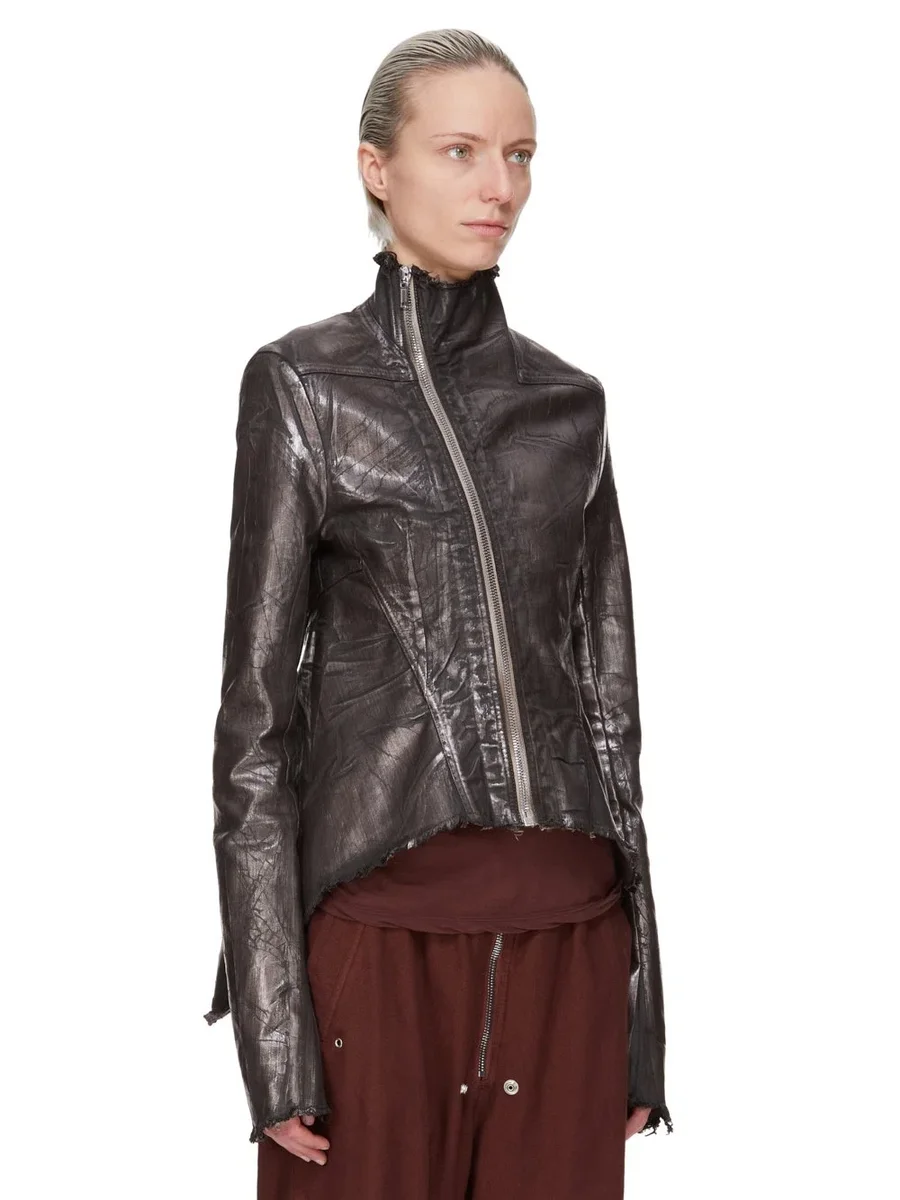 THIS NASKA GARY JACKET IS BELOW WAIST LENGTH WITH A SKIN TIGHT FIT. IT HAS LONG SLEEVES, A HIGH NECK WITH AN ASYMMETRICAL ZIP FRONT OPENING AND LEVEL SHOULDER SEAMS WITH TOPSTITCHING. IT FEATURES A CURVED NASKA HEMLINE THAT DIPS INTO TWO POINTS AT THE BACK AND HAS RAW CUT HEMS AND EDGES.