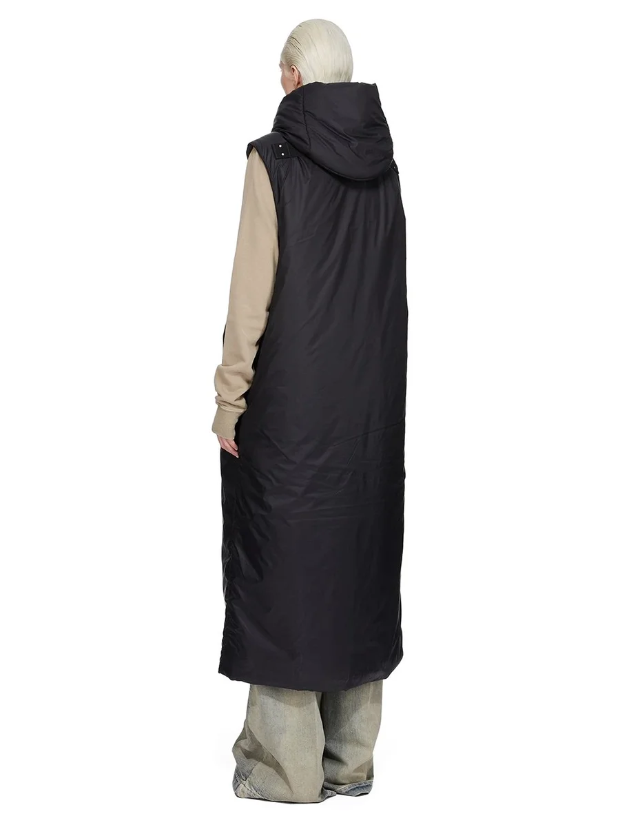 THIS HOODED LINER IS BELOW KNEE LENGTH AND SLEEVELESS. IT FEATURES OFF-CENTER FRONT CONCEALED SNAP CLOSURES, A HOOD, SIDE WELT POCKETS AND A COTTON WEBBING STRAP WITH RIVET DETAIL ACROSS THE BACK. IT IS FULLY LINED WITH INTERNAL QUILTING AND TWO SNAP POCKETS.