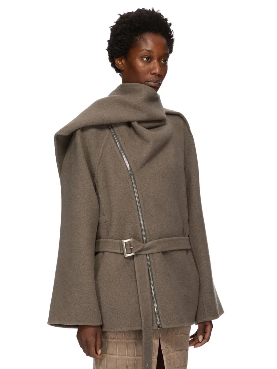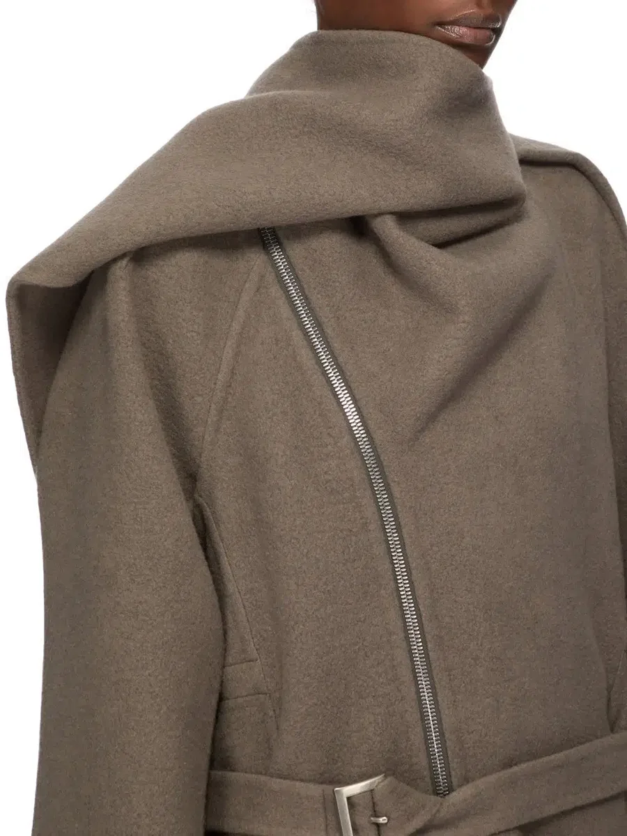 THIS SCARF FLIGHT IS BELOW HIP LENGTH AND HAS LONG WIDE SLEEVES. IT FEATURES AN OFF CENTRE ZIPPER CLOSURE THAT CLOSES ON THE SIDE NECK AND IS COVERED BY AN ATTACHED SCARF SEGMENT THAT IS WORN OVER THE RIGHT SHOULDER. IT HAS A BELT AT WAIST HEIGHT THAT FASTENS WITH A BUCKLE. IT HAS SHOULDER SEAM FOLD DETAIL, A CONCEALED ZIPPED POCKET IN THE LEFT FOREARM AND SIDE SEAM POCKETS.