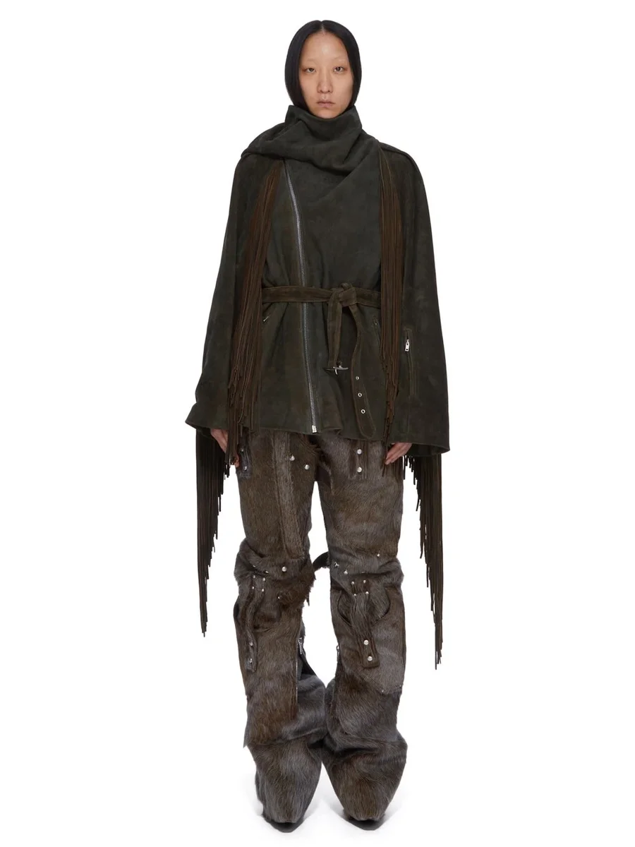 THIS SCARF FLIGHT IS BELOW HIP LENGTH AND HAS LONG WIDE SLEEVES. IT FEATURES AN OFF CENTRE ZIPPER CLOSURE THAT CLOSES ON THE SIDE NECK AND IS COVERED BY AN ATTACHED SCARF SEGMENT THAT IS WORN OVER THE RIGHT SHOULDER. IT HAS A BELT AT WAIST HEIGHT THAT FASTENS WITH A BUCKLE. IT HAS SHOULDER SEAM FOLD DETAIL, A CONCEALED ZIPPED POCKET IN THE LEFT FOREARM AND SIDE SEAM POCKETS. IT IS FULLY LINED WITH INTERNAL ZIPPERED POCKETS. THIS VERSION HAS A FRINGED BACK AND SLEEVES.