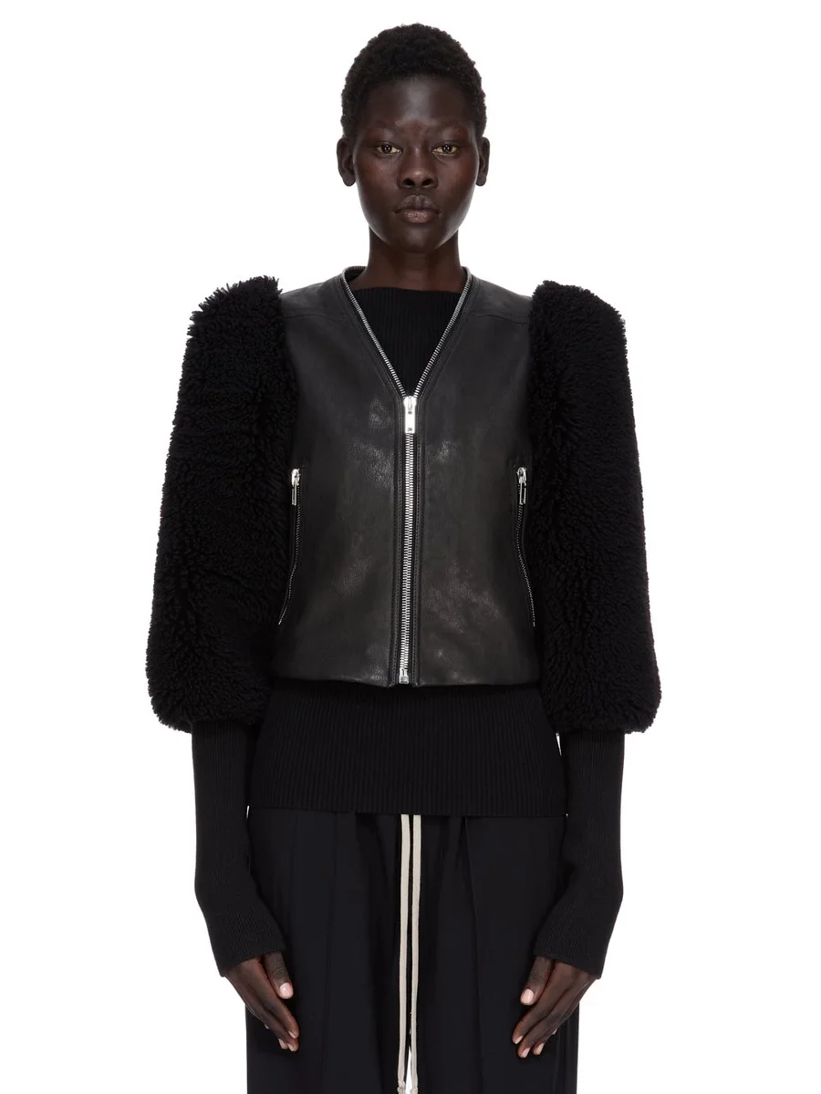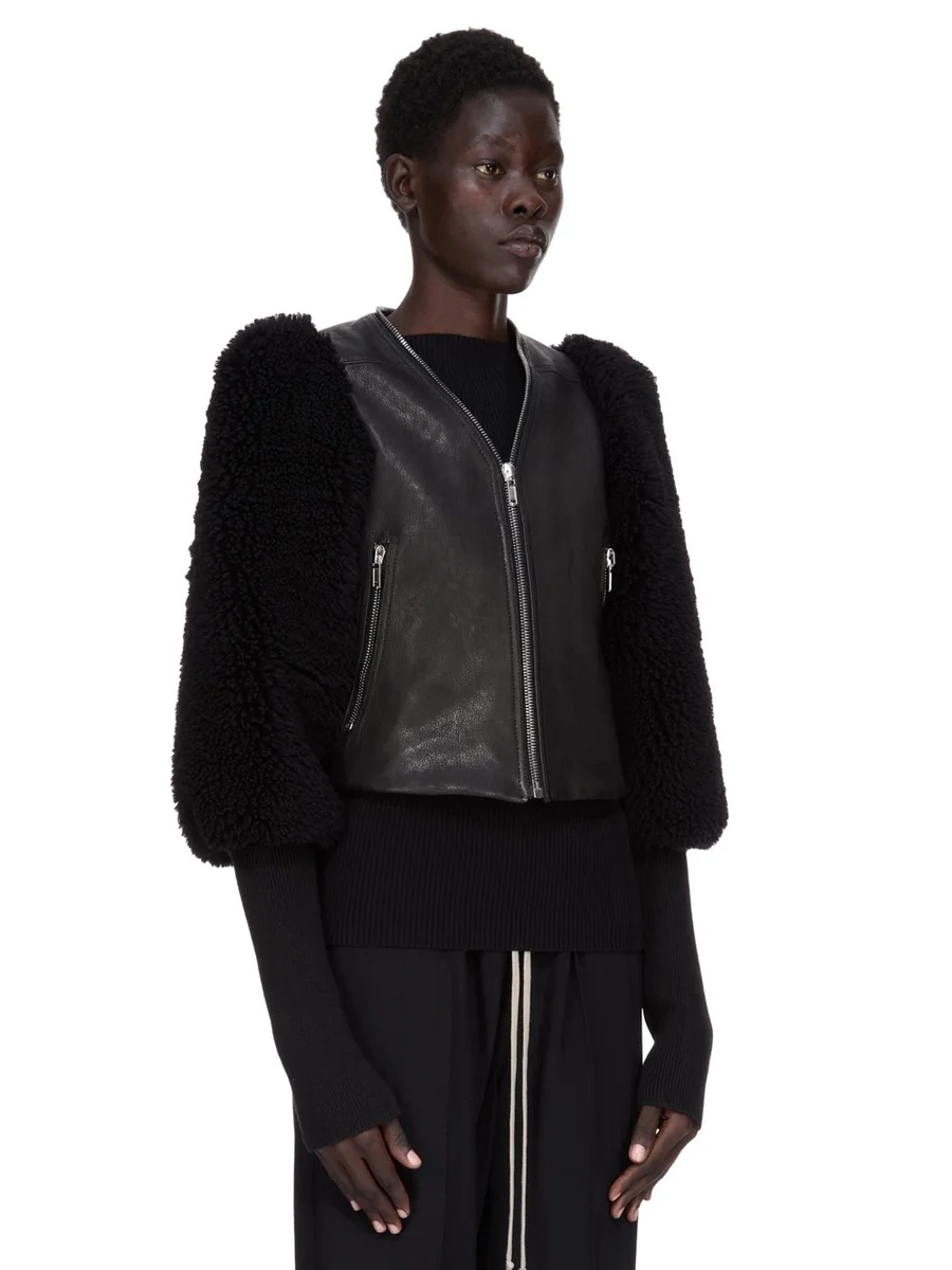 RICK OWENS FW25 CONCORDIANS CROPPED KLAUS IN BLACK CURLY SHEARLING AND WAXY GOAT LEATHER