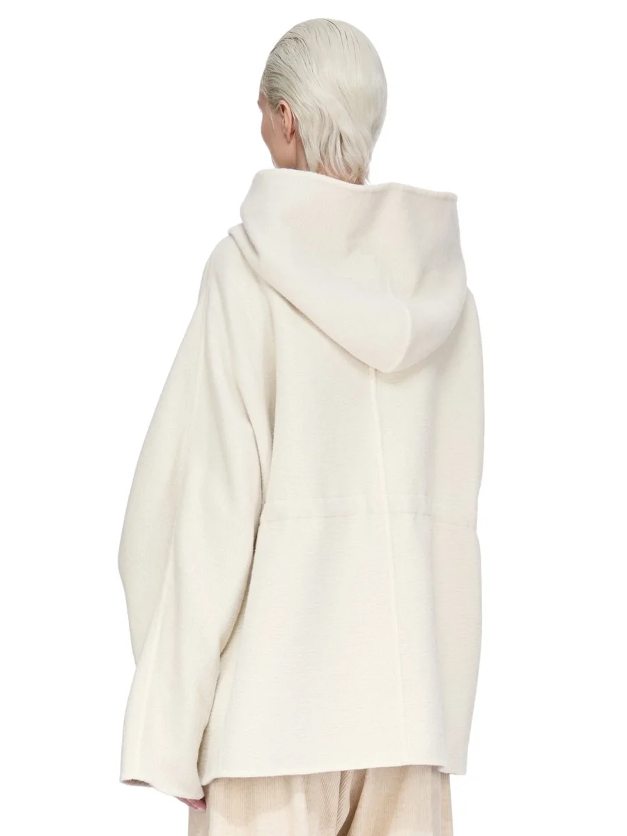 THIS ZIPFRONT HOODED JKT IS HIP LENGTH WITH A VOLUMINOUS FIT. IT HAS WIDE SHOULDERS WHICH FALL INTO LONG SLEEVES, AND AN OFF-CENTRE FRONT ZIPPER THAT REACHES UP UNDER THE CHIN AND A LARGE HOOD. IT FEATURES A STITCHED WAISTBAND WITH INNER CORD WHICH CAN PULL THE JACKET IN, TO GATHER AT THE WAIST AND CREATE A PEPLUM SHAPE.