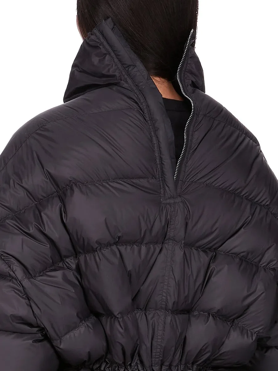THIS SAIL DUVET IS HIP LENGTH WITH A VOLUMINOUS FIT. IT HAS WIDE SHOULDERS WHICH FALL INTO LONG SLEEVES, AND A CENTRE FRONT OPENING WITH CONCEALED SNAPS AND A HIGH NECK. IT FEATURES A STITCHED WAISTBAND WITH INNER CORD WHICH CAN PULL THE JACKET IN, TO GATHER AT THE WAIST AND CREATE A PEPLUM SHAPE.