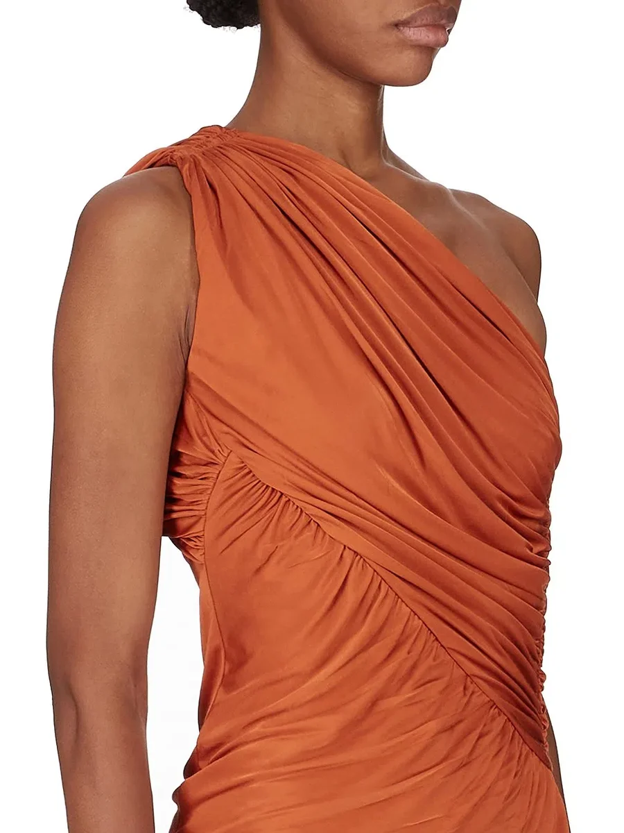 RICK OWENS FW25 CONCORDIANS AMIRA DRESS IN ORANGE SATIN VISCOSE JERSEY.