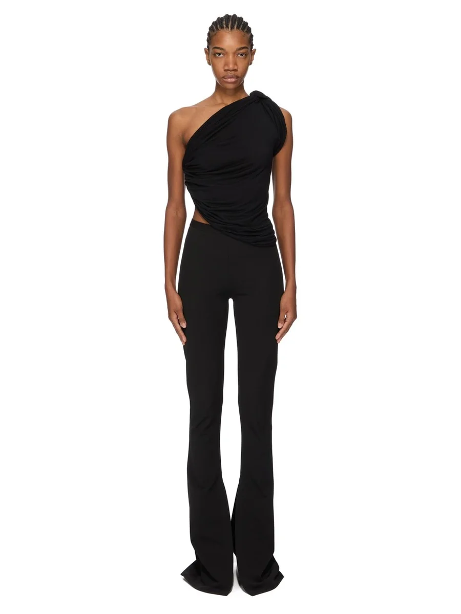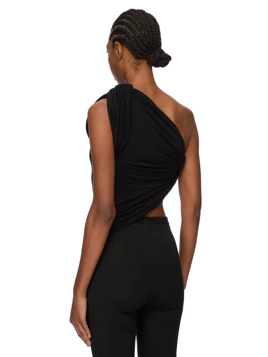 THIS ANITA TOP IS WAIST LENGTH ON LEFT BODY AND SLEEVELESS. IT HAS A TIGHT FITTING BODY, WITH DRAPING GATHERING INTO AN ASYMMETRICAL LEFT SHOULDER AND TWISTING AROUND TO CIRCLE THE LEFT ARM. IT FEATURES A CENTRE BACK TWIST AND MULTIPLE DRAPINGS WITH A SCOOP SIDE THAT REVEALS THE BODY.