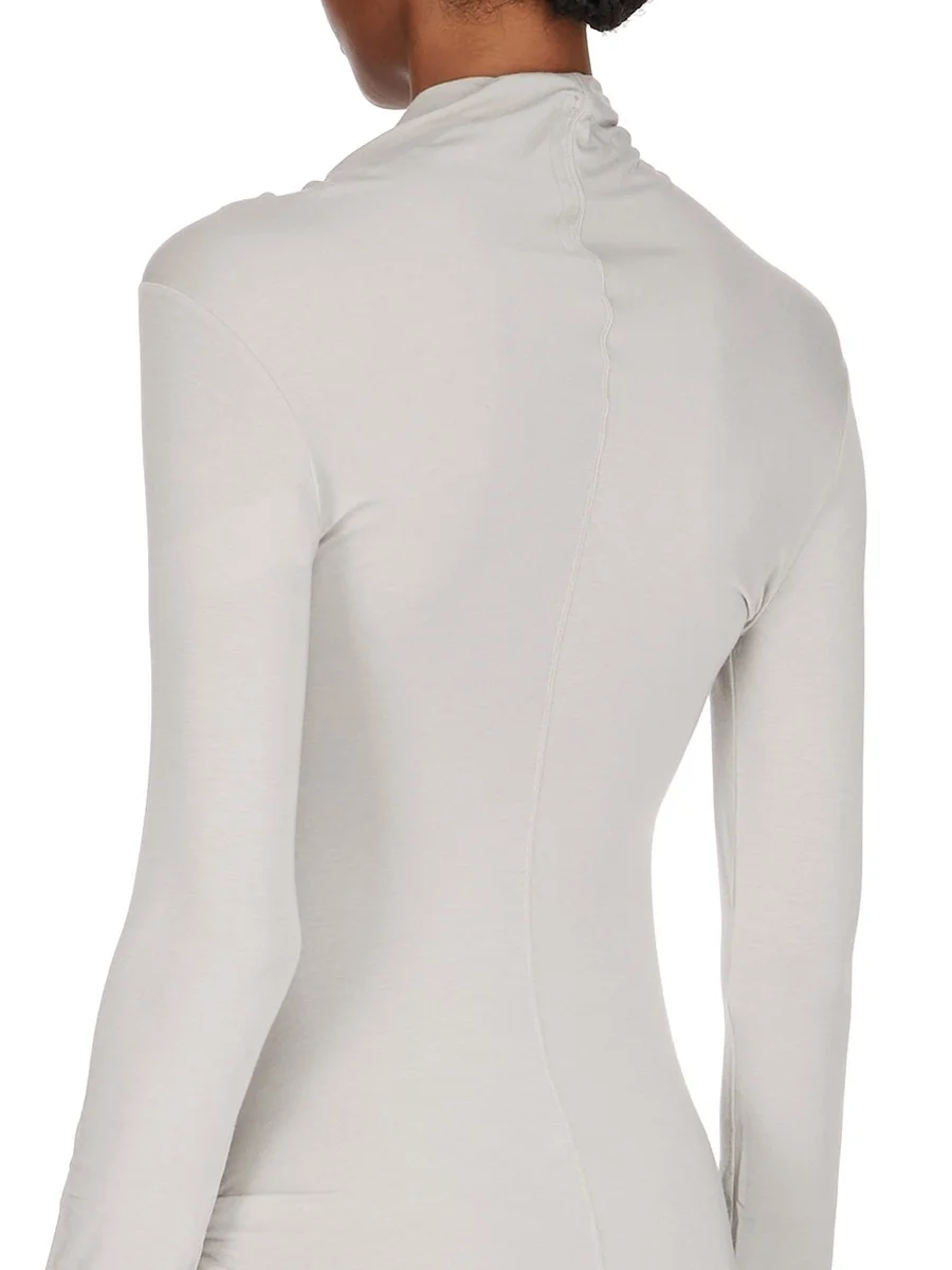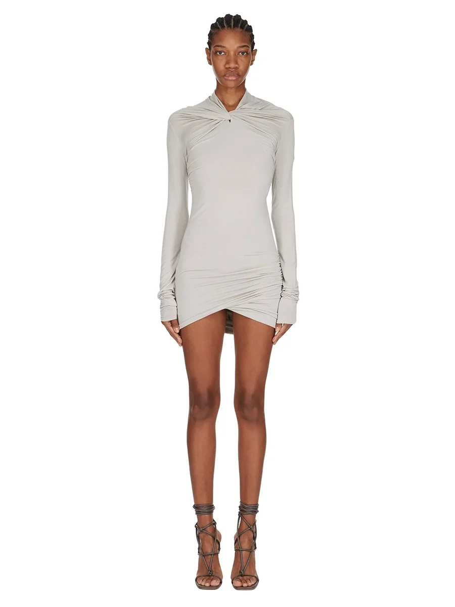 THIS KAIRO MINI IS A MID-THIGH LENGTH MINI DRESS WITH LONG SLIM SLEEVES AND A CLOSE TO THE BODY FIT. IT FEATURES A COWL NECK IN BACK WITH A FRONT TWIST AND DRAPINGS OVER UPPER CHEST AND SHOULDERS AND ON THE LEFT HIP.