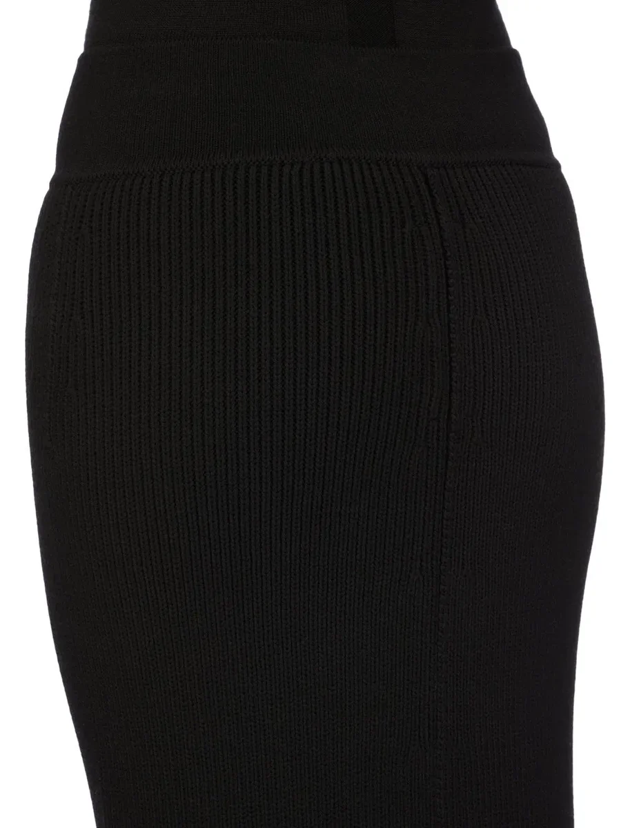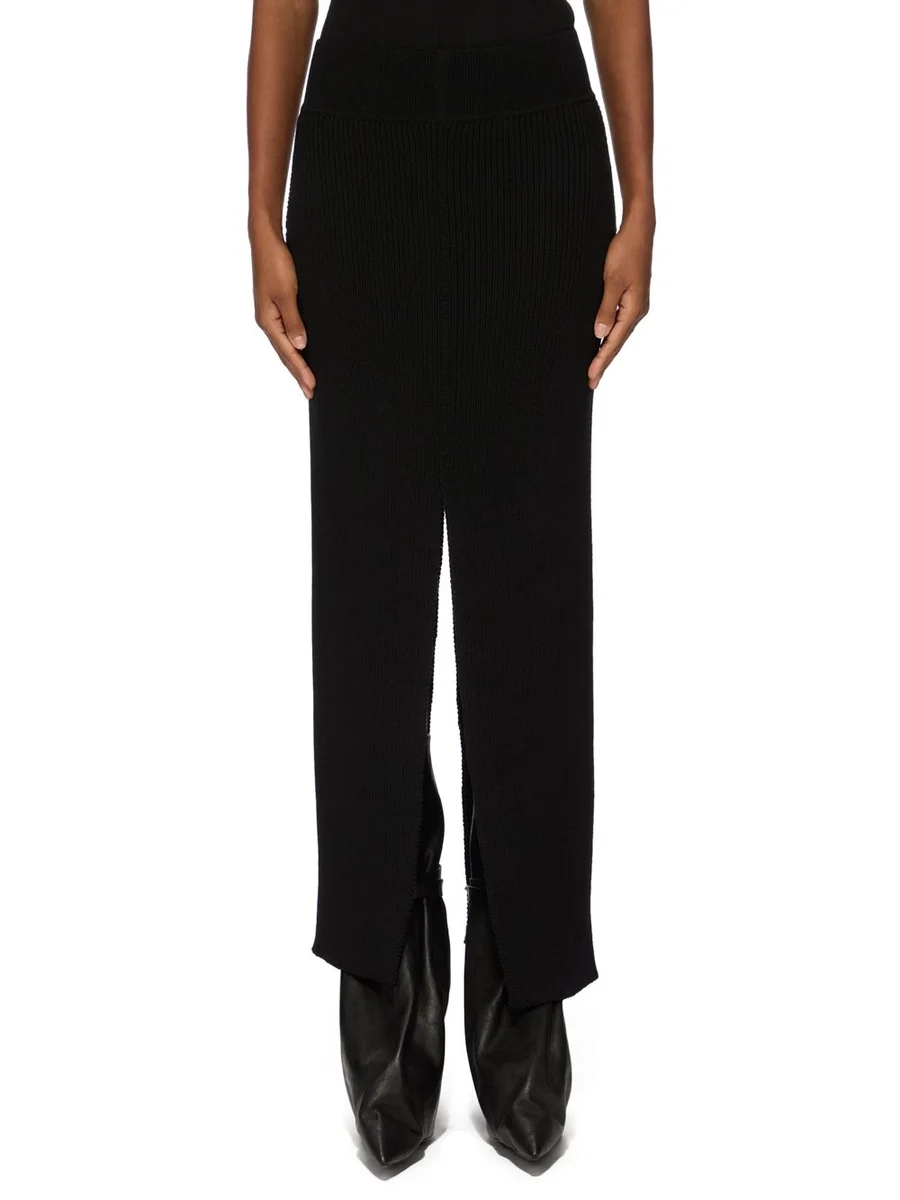 THIS SLICED SKIRT IS ANKLE LENGTH AT SIDES. IT HAS AN ELASTICIZED WAISTBAND AND A CLOSE TO THE BODY FIT. IT FEATURES TWO HIGH SLITS FRONT AND BACK.