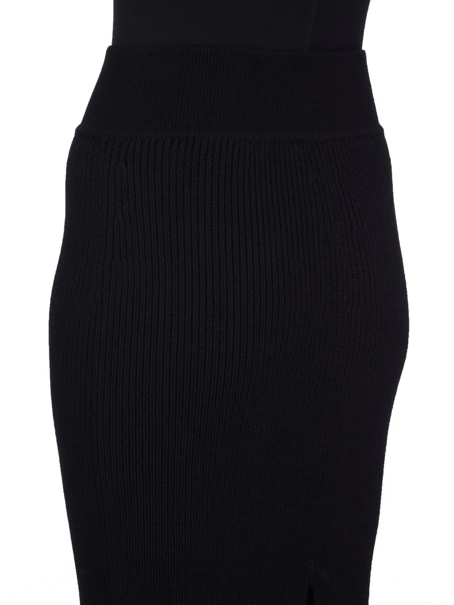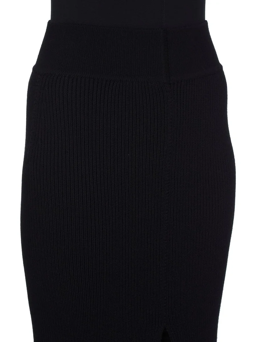 THIS SLICED SKIRT IS FLOOR LENGTH AT SIDES. IT HAS AN ELASTICIZED WAISTBAND AND A CLOSE TO THE BODY FIT. IT FEATURES TWO HIGH SLITS FRONT AND BACK.