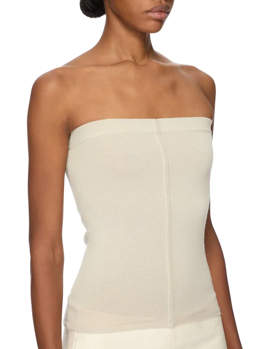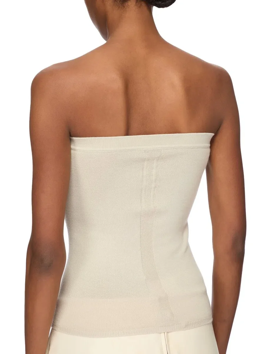 THIS BANDEAU TOP IS A SIMPLE TIGHT KNIT TUBE TOP FINISHING BELOW THE HIP. T HAS A FRONT SEAM AND A SIGNATURE CHANNEL RUNNING DOWN THE SPINE.