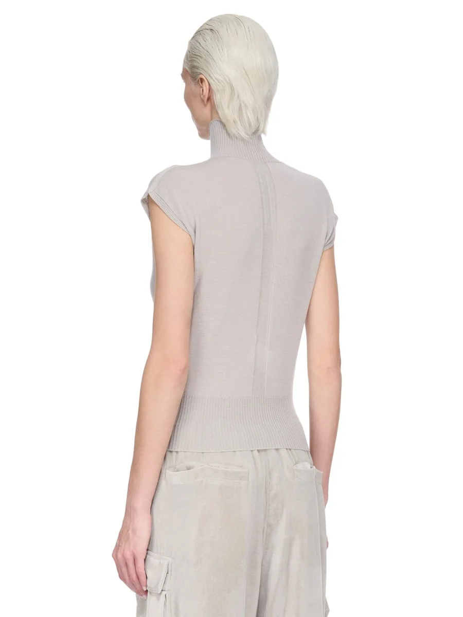 THIS SL TURTLE IS ABOVE HIP LENGTH, IT HAS WIDE SHOULDERS AND IS SLEEVELESS. IT HAS A RIBBED TURTLE NECK AND WIDE RIBBED WAISTBAND, AND THE SIGNATURE KNIT CHANNEL RUNNING DOWN THE CENTRE BACK SPINE.