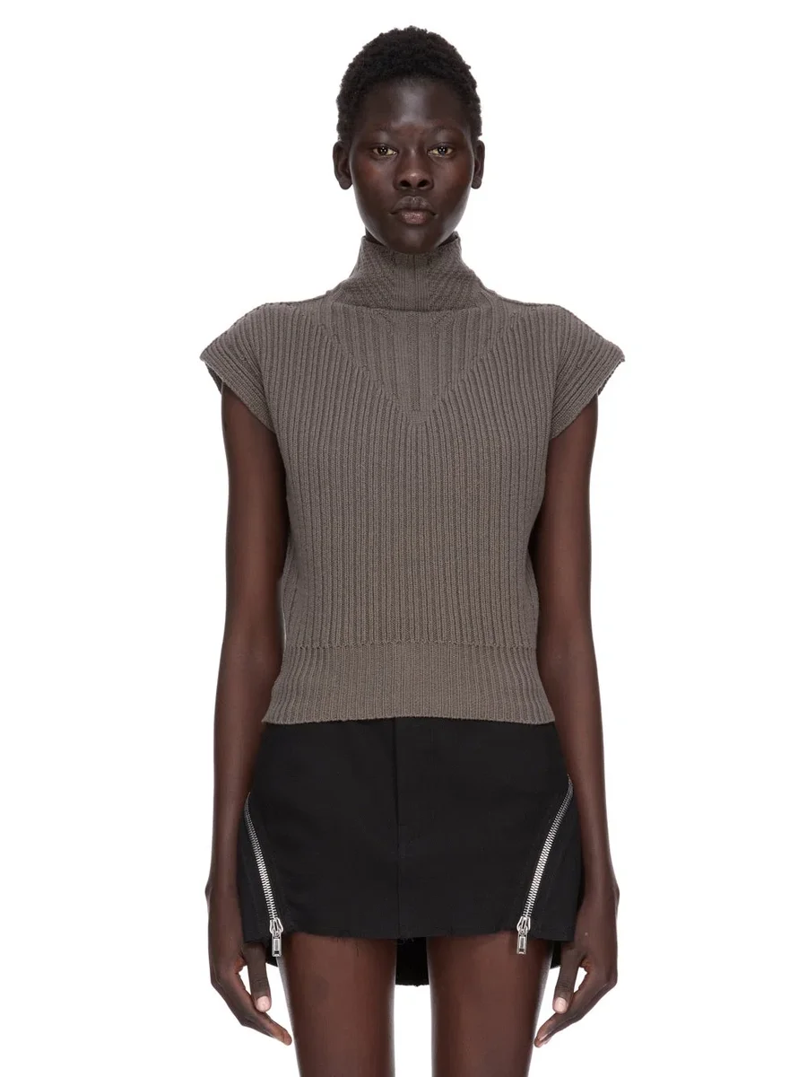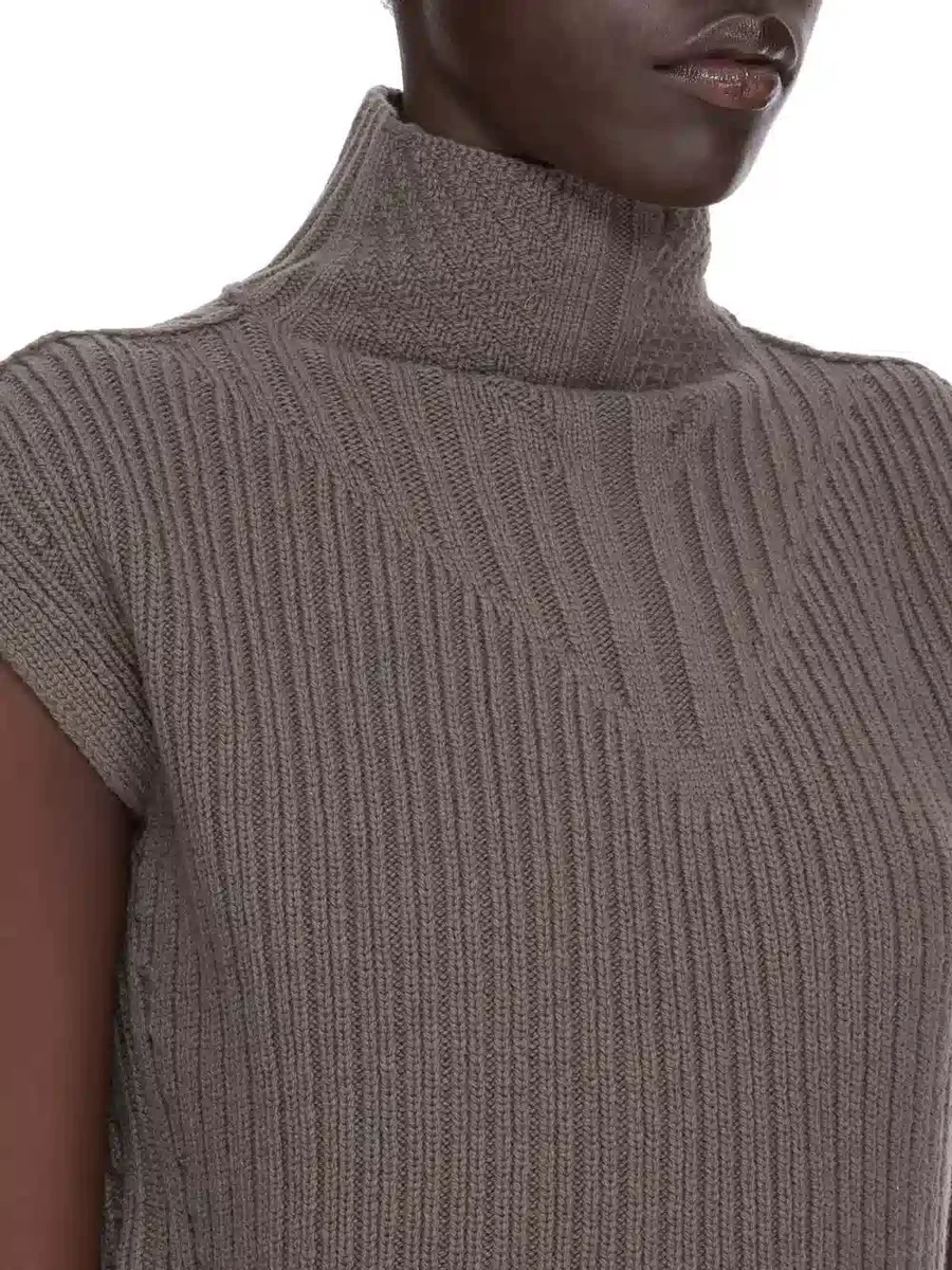THIS SL TURTLE IS ABOVE HIP LENGTH, IT HAS WIDE SHOULDERS AND IS SLEEVELESS. IT HAS A TURTLE NECK AND WIDE WAISTBAND IN SLIM RIBBING. IT FEATURES A MEGARIB KNIT DESIGN, WITH A WIDE VERTICAL RIB THE BACK AND FRONT BODY, AND DIAGONAL LINES RUNNING DOWNWARDS INTO THE CENTRE FRONT. IT HAS A VERTICAL RIB BACK WITH THE SIGNATURE KNIT CHANNEL RUNNING DOWN THE CENTRE BACK SPINE.