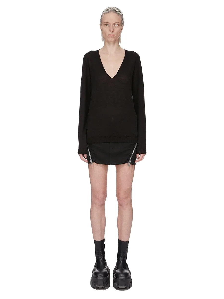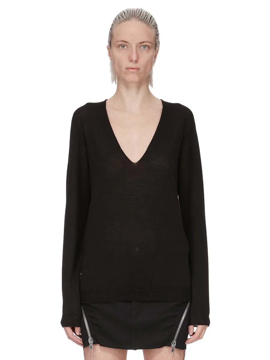 RICK OWENS FW25 CONCORDIANS V NECK PULL IN BLACK LIGHTWEIGHT RASATO KNIT