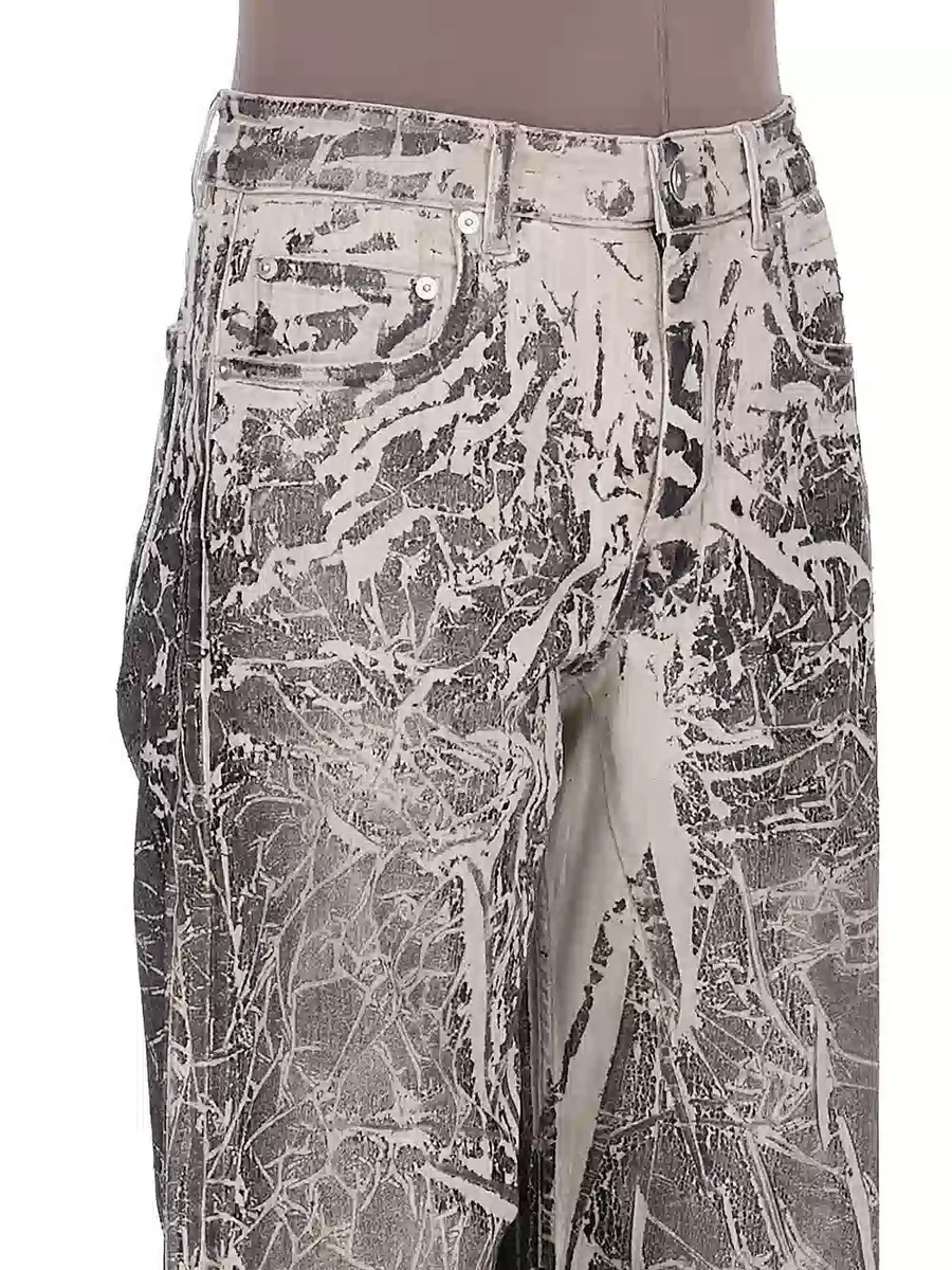 THIS LIGHTWEIGHT WASHED FOIL DENIM IS MADE ON A 10OZ BLACK AND NATURAL STRETCH DENIM. THE READY GARMENT IS BLEACHED INTO A DIRTY PEARL COLOR, A BLACK FOIL OVERLAY IS THEN APPLIED AND FINALLY THE GARMENT IS WASHED TO ACHIEVE THE IRREGULAR LOOK.