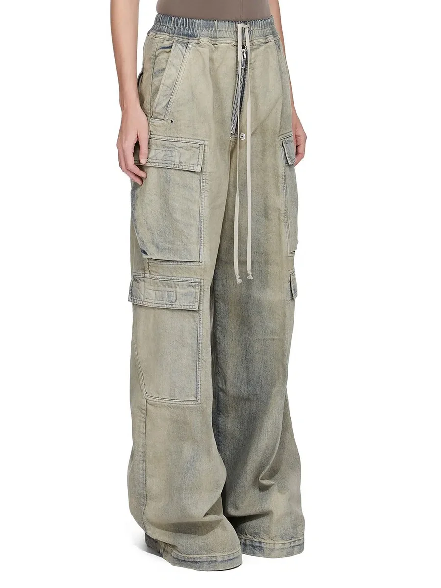 THESE DOUBLE CARGO JUMBO BELA PANTS ARE FULL-LENGTH WITH A LOW CROTCH AND WIDE LEG. THEY FEATURE AN ELASTICIZED WAISTBAND WITH DRAWSTRING AND A BELA EXPOSED CENTER ZIPPER WITH TWO SNAP DETAIL, AND SIDE WELT POCKETS WITH RIVETS. THEY FEATURE TWO BEVELED CARGO POCKETS ON THE THIGH, WITH TWO SQUARE CARGO POCKETS BELOW AND TWO SQUARE BACK POCKETS. THEY ALL HAVE FLAPS AND TOPSTITCHING.