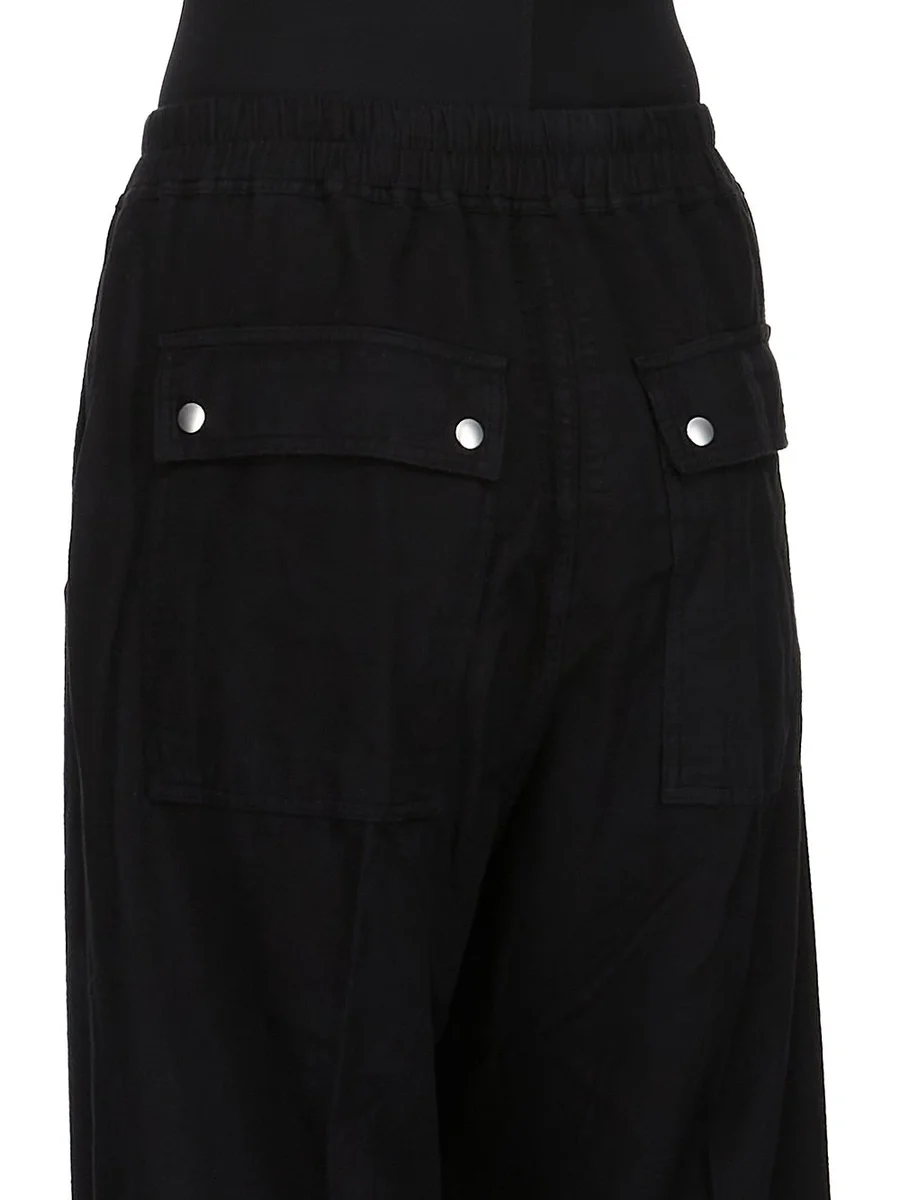 THESE GETH BELA PANTS ARE FULL-LENGTH WITH A LOW CROTCH AND WIDE LEG. THEY FEATURE AN ELASTICIZED WAISTBAND WITH VERTICAL STITCHING AND DRAWSTRING AND A BELA EXPOSED CENTER ZIPPER WITH TWO SNAP DETAIL AT BOTTOM. THEY HAVE SIDE POCKETS WITH EYELET AND RIVET DETAIL AND BACK POCKETS WITH FLAPS AND VISIBLE SNAP CLOSURES.