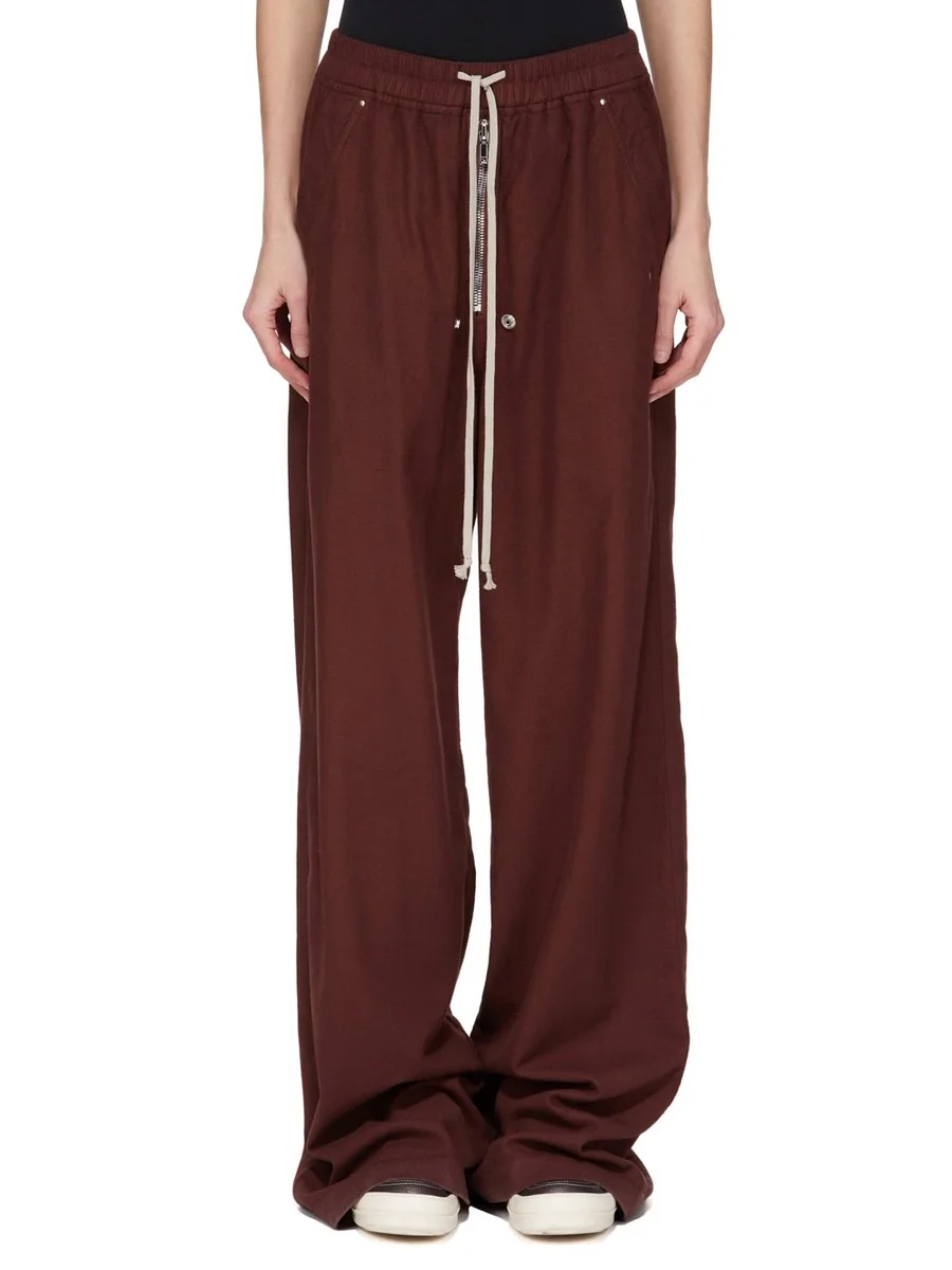 THESE GETH BELA PANTS ARE FULL-LENGTH WITH A LOW CROTCH AND WIDE LEG. THEY FEATURE AN ELASTICIZED WAISTBAND WITH VERTICAL STITCHING AND DRAWSTRING AND A BELA EXPOSED CENTER ZIPPER WITH TWO SNAP DETAIL AT BOTTOM. THEY HAVE SIDE POCKETS WITH EYELET AND RIVET DETAIL AND BACK POCKETS WITH FLAPS AND VISIBLE SNAP CLOSURES.