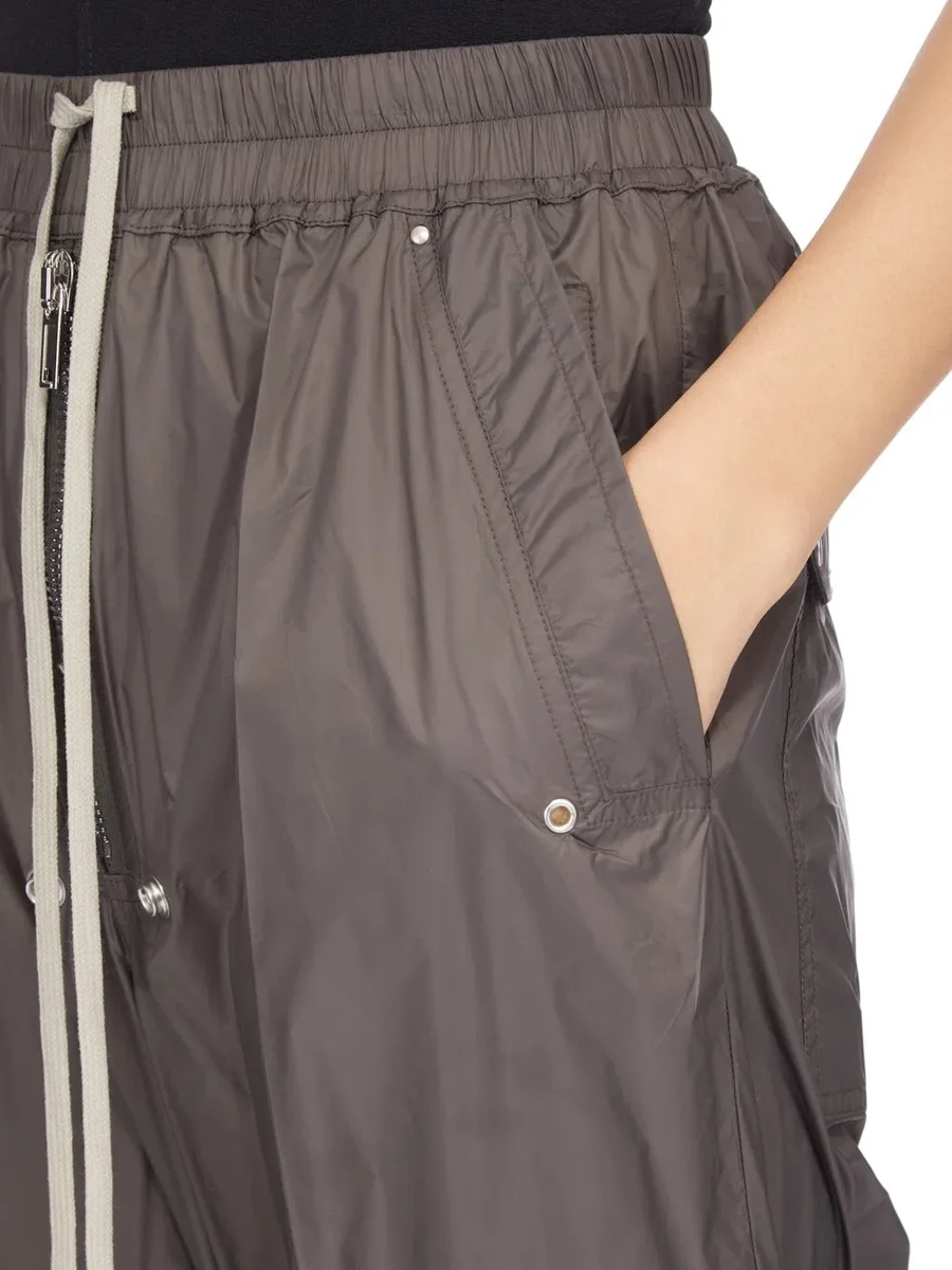 THESE GETH BELA PANTS ARE FULL-LENGTH WITH A LOW CROTCH AND WIDE LEG. THEY FEATURE AN ELASTICIZED WAISTBAND WITH VERTICAL STITCHING AND DRAWSTRING AND A BELA EXPOSED CENTER ZIPPER WITH TWO SNAP DETAIL AT BOTTOM. THEY HAVE SIDE POCKETS WITH EYELET AND RIVET DETAIL AND BACK POCKETS WITH FLAPS AND VISIBLE SNAP CLOSURES.