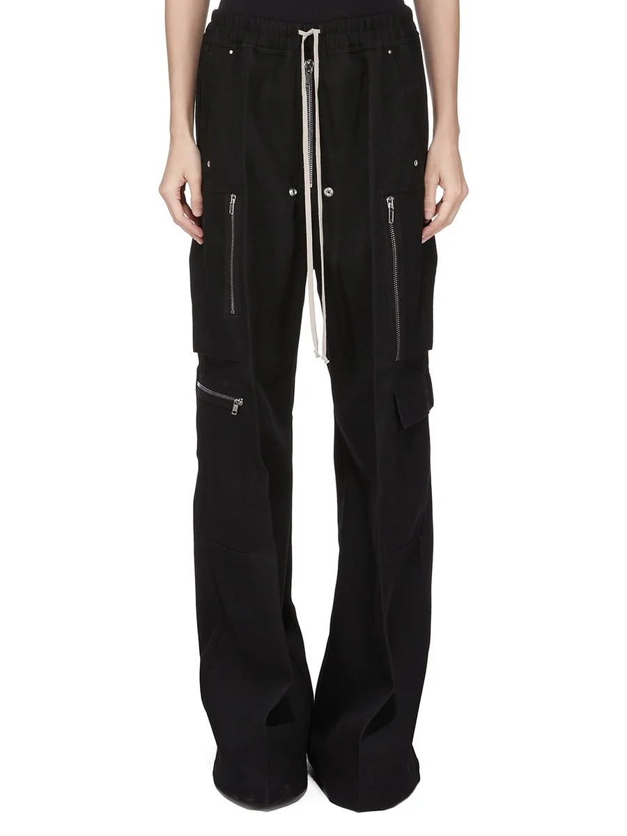 THESE CARGOBELAS PANTS ARE FULL-LENGTH WITH A LOW CROTCH AND WIDE LEG. THEY FEATURE AN ELASTICIZED WAISTBAND WITH DRAWSTRING AND A BELA EXPOSED CENTER ZIPPER WITH TWO SNAP DETAIL AT BOTTOM. THEY HAVE SIDE WELT POCKETS WITH RIVET AND EYELET DETAIL, FOUR BEVELED CARGO POCKETS ON THE SIDE LEG AND TWO REAR WELT POCKETS WITH CONCEALED SNAPS AND TOPSTITCHING.