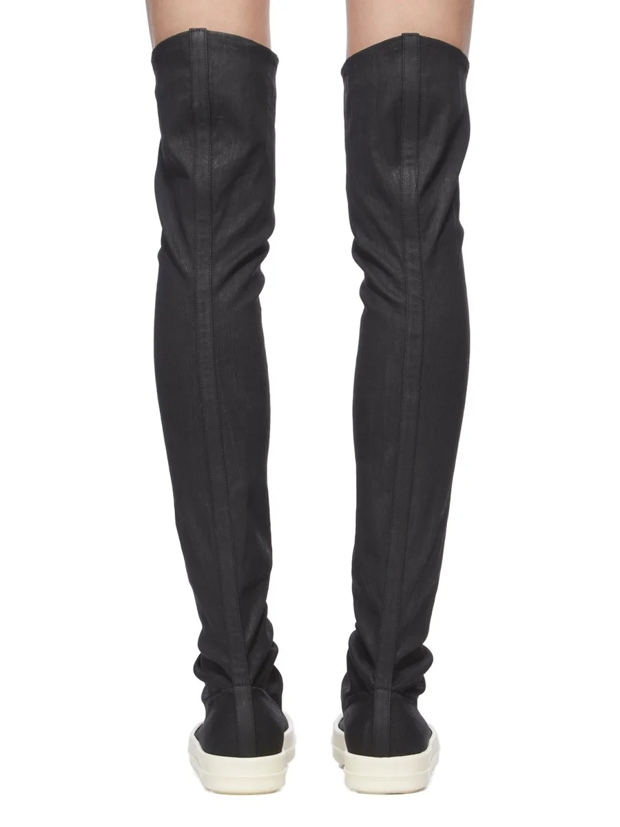 THESE HIGH SOCK SNEAKS ARE MID-THIGH HEIGHT. THEY HAVE STRETCH DENIM STOCKING UPPERS, WITH DRAPING AROUND THE UPPER FOOT AND ANKLE, TOE CAPS AND SHARK TOOTH SOLES.
