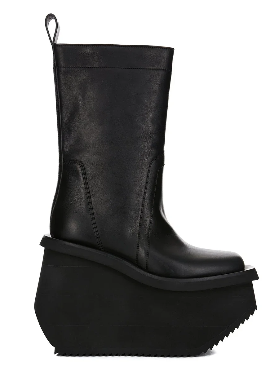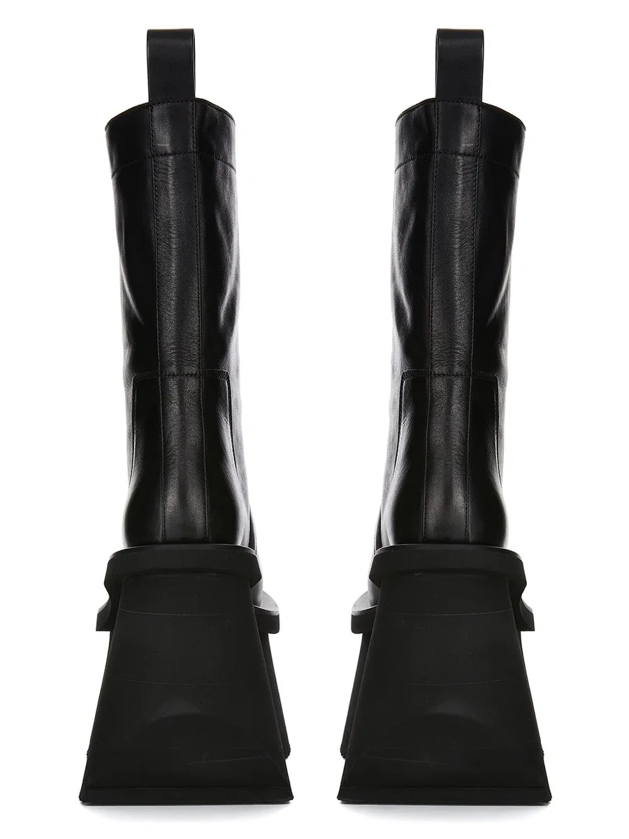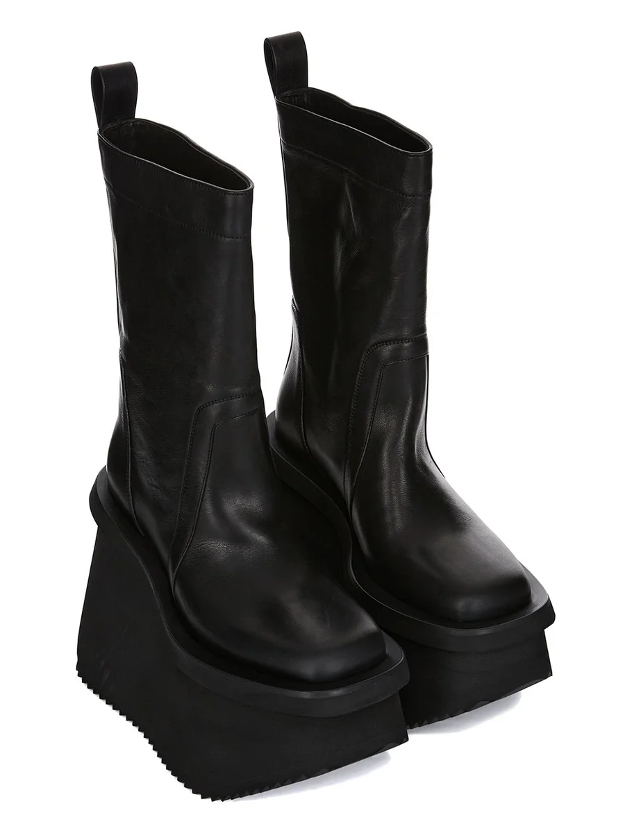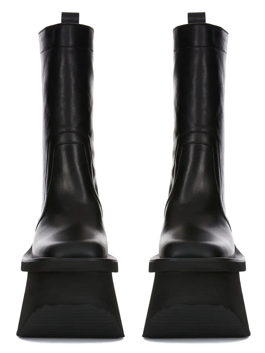 THESE FACTORY BOOTS ARE MID-CALF HEIGHT. THEY HAVE A TOPSTITCHED SEAM ARCING OVER THE FRONT FOOT WITH STITCHING RUNNING OVER THE ANTERIOR ANKLE. THEY FEATURE AN ANGULAR HEEL COUNTER AND A BACK LOOP PULL TAB AND HAVE 14CM HIGH SHARK-TOOTH SOLE UNDERNEATH AND AT FRONT AND HAVE A SLANTING HEEL AND INCLINED TOE PLATFORM.