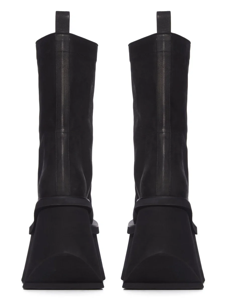 THESE FACTORY BOOTS ARE MID-CALF HEIGHT. THEY HAVE A TOPSTITCHED SEAM ARCING OVER THE FRONT FOOT WITH STITCHING RUNNING OVER THE ANTERIOR ANKLE. THEY FEATURE AN ANGULAR HEEL COUNTER AND A BACK LOOP PULL TAB AND HAVE 14CM HIGH SHARK-TOOTH SOLE UNDERNEATH AND AT FRONT AND HAVE A SLANTING HEEL AND INCLINED TOE PLATFORM.