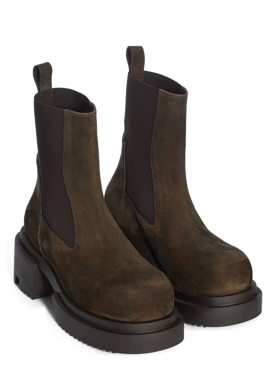 THESE BEATLE BOGUN BOOTS ARE ABOVE-ANKLE HEIGHT. THEY HAVE GEOMETRIC SIDE PANELS IN STRETCH ELASTIC, AN ANGULAR HEEL COUNTER WITH TOP STITCHING AND A BACK LOOP PULL TAB. THEY HAVE A ROUNDED TOE AND FEATURE A BOGUN RUBBER MEGA CREEPER SOLE WITH A TOOTHED SQUARE HEEL.