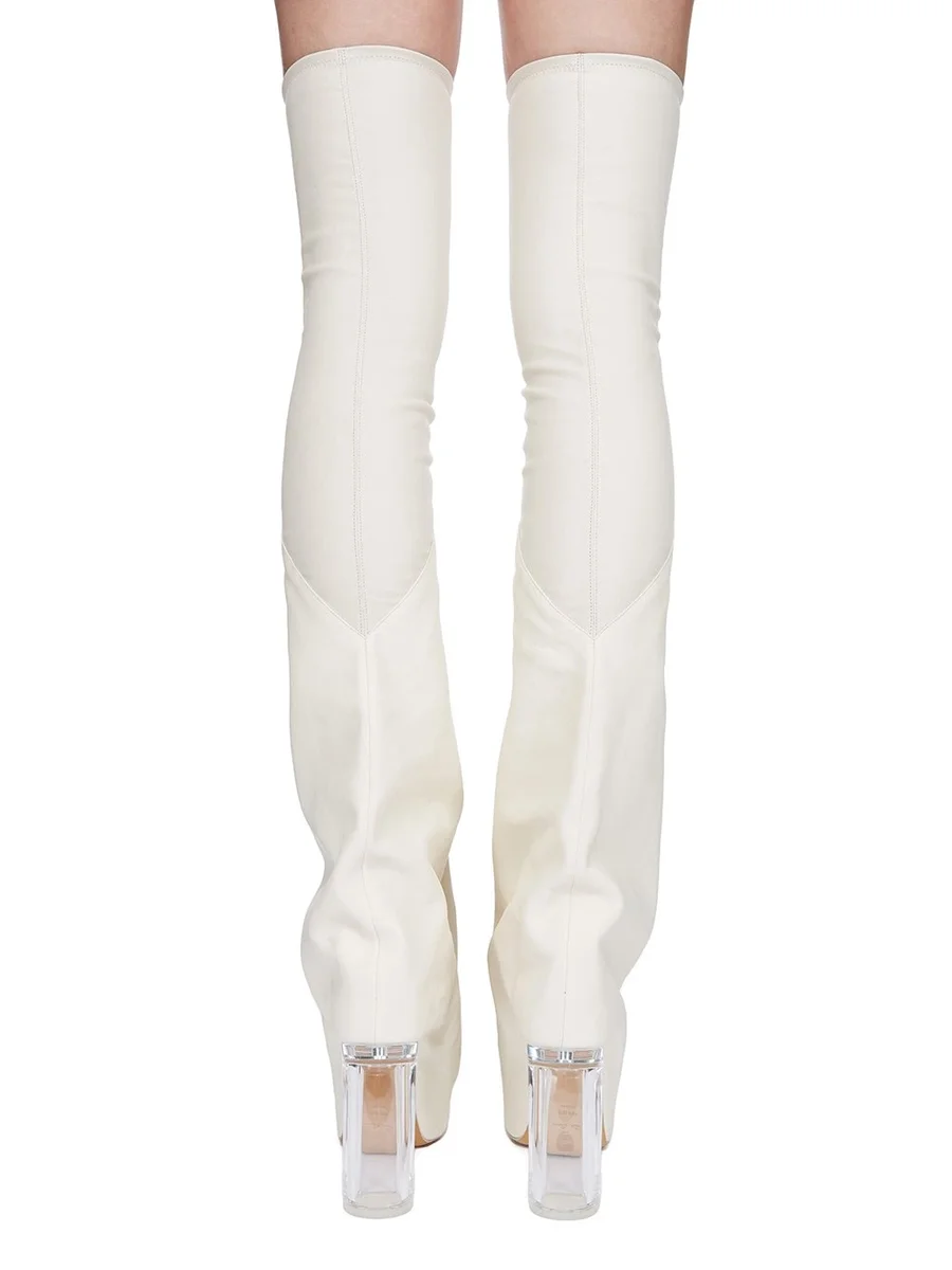 THESE TACO KISS BOOTS ARE A DEFLATED VERSION OF OUR STRAYTUKAY COLLABORATION BOOTS. THEY ARE THIGH HIGH. THEY HAVE A TIGHT SOCK UPPER, JOINING TO A DIAGONAL SEAM LINE THAT SLOPES FROM MIDPOINT, OVER THE KNEE, DOWN TO THE CENTRE BACK CALF. THEY FEATURE A LEATHER UPPER THAT FLARES DOWN THE LOWER LEG, CURVING INTO THE BACK HEEL AND POINTING AT THE TOE. THEY HAVE A 12CM TRANSPARENT HEEL (4,5CM RISE) AND A THICK FRONT PLATFORM.