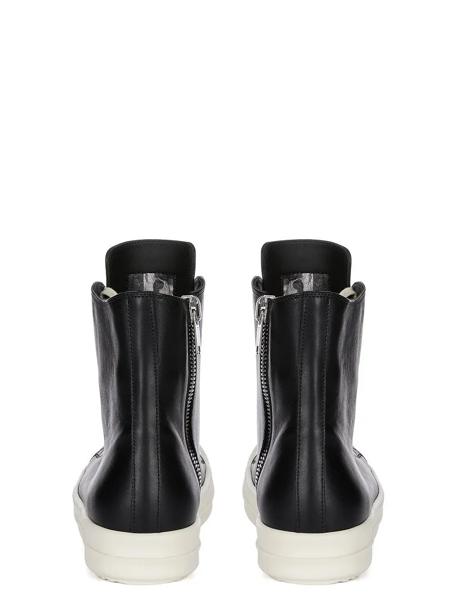 THESE SNEAKERS ARE ABOVE-ANKLE HEIGHT AND FEATURE SEVEN EYELETS, LACES, A ZIPPER ON THE INSIDE ANKLE FOR EASY FASTENING, TOE CAPS AND SHARK-TOOTHED BUMPER SOLES.