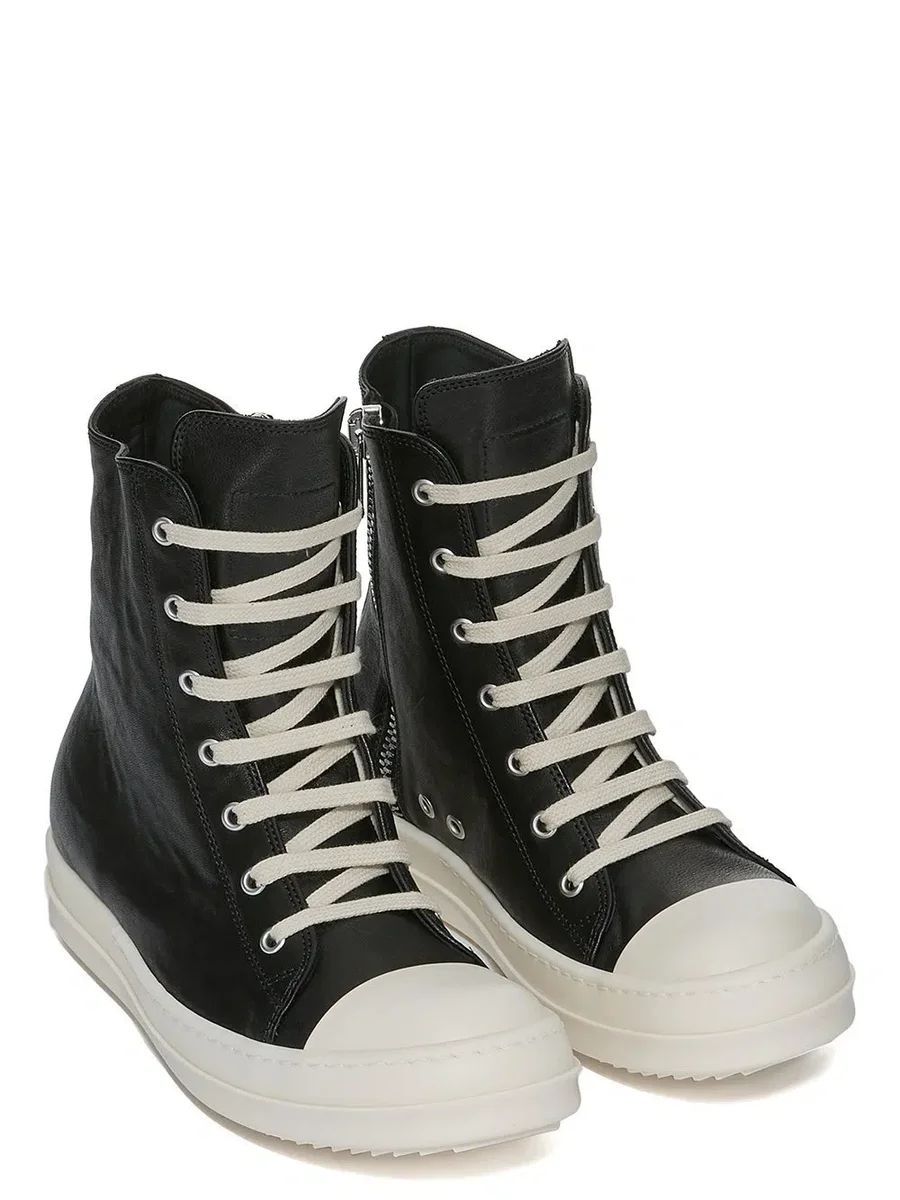 THESE SNEAKERS ARE ABOVE-ANKLE HEIGHT AND FEATURE SEVEN EYELETS, LACES, A ZIPPER ON THE INSIDE ANKLE FOR EASY FASTENING, TOE CAPS AND SHARK-TOOTHED BUMPER SOLES.