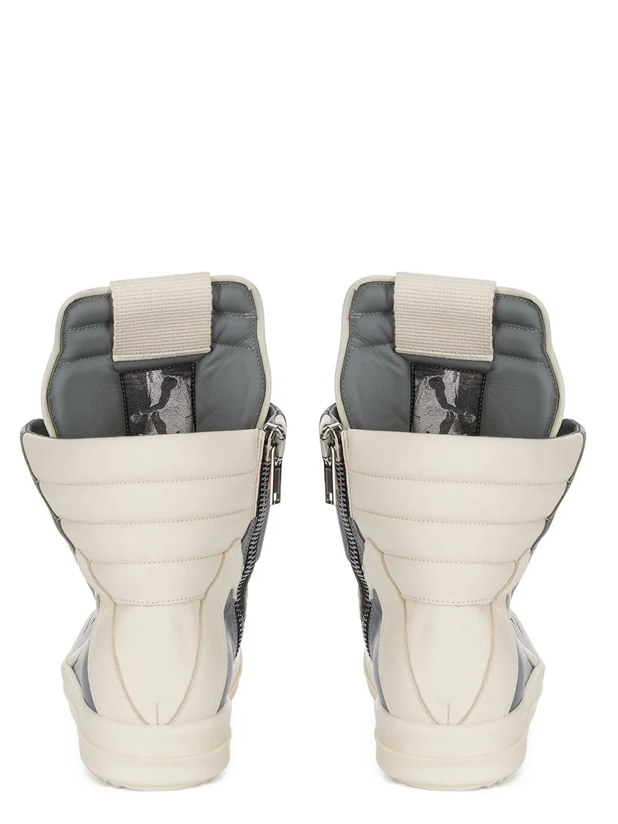 THESE JUMBOLACE GEOBASKETS ARE ABOVE-ANKLE HEIGHT. THEY FEATURE AN EXTENDED TONGUE WITH WEBBING TAB, SIGNATURE GEOMETRIC PANELS AND A PADDED BACK COUNTER WITH LINES OF TOPSTITCHING. THEY HAVE JUMBO LACES, A ZIPPER ON THE INSIDE ANKLE FOR EASY FASTENING AND SHARK-TOOTHED BUMPER SOLES.