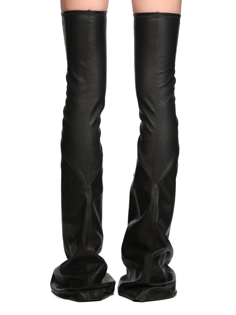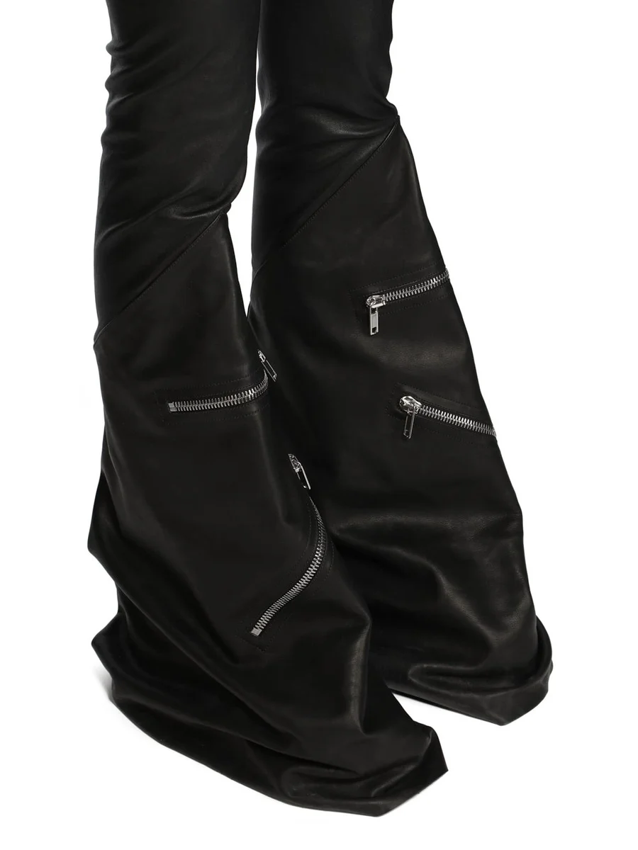 THESE CARGO FETISH SNEAKS ARE ABOVE-KNEE HIGH WITH A STRETCH LEATHER TOP. THEY HAVE A BOOT SHAPED UPPER WITH AN ADDITIONAL LAYER FALLING FROM AN ASYMMETRICAL SEAM LINE, GRAZING THE FLOOR. THEY FEATURE TWO FRONT ZIPPERS, ONE HORIZONTAL AND ON ANGLED. THEY HAVE MILK TOE CAPS AND SHARK TOOTH SOLES.