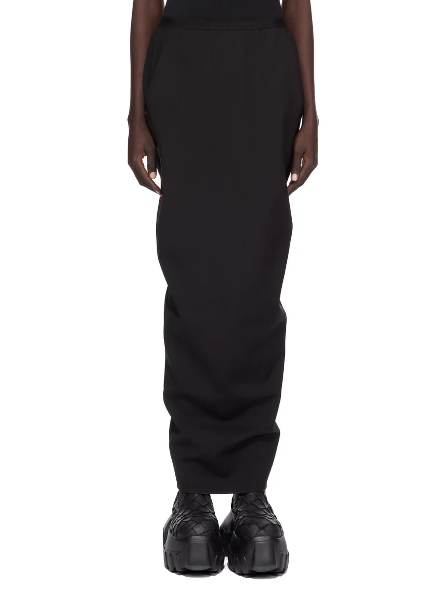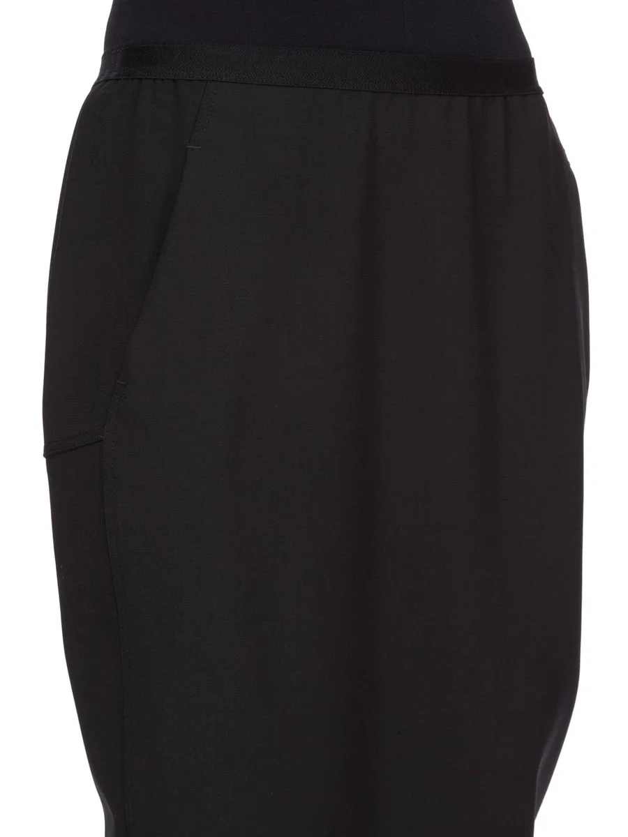 THIS SOFT PILLAR LONG SKIRT IS ANKLE-LENGTH. IT HAS AN ELASTIC WAISTBAND SIDE POCKETS. IT TAPERS TO THE ANKLE, AND HAS A SPLIT IN THE CENTRE BACK SEAM UP TO THE KNEE.
