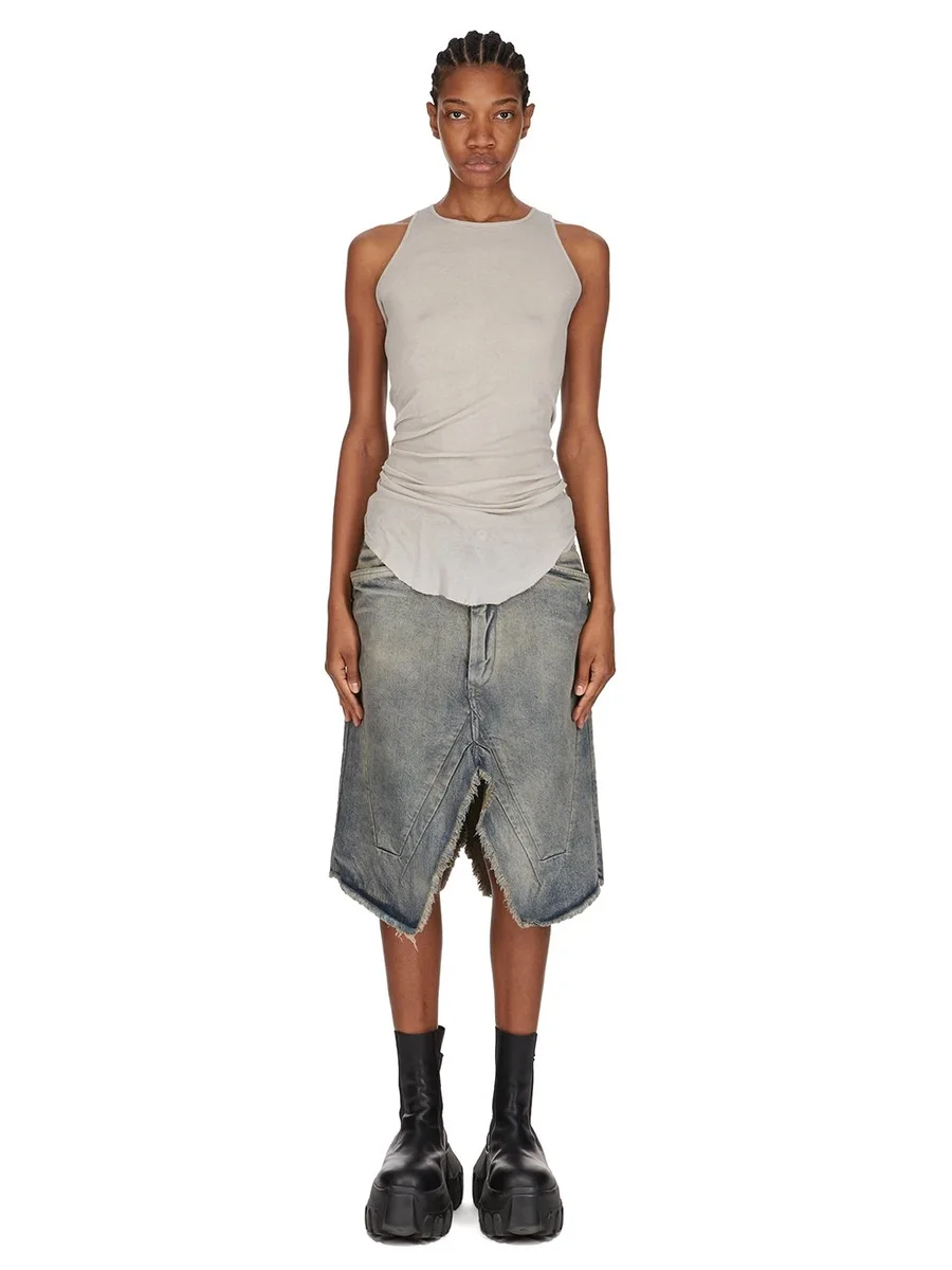 THIS SLIVERED SKIRT IS A KNEE LENGTH 5 POCKET JEAN SKIRT. IT HAS A WAISTBAND WITH CONCEALED ZIP FLY, TOP BUTTON AND BELT LOOPS WITH RIVETS. IT PEAKS SLIGHTLY BETWEEN THE LEGS, TAPERING TO POINTS AT THE KNEE, AND FEATURES ANGULAR GEO PANELS ON THE FRONT THIGHS.