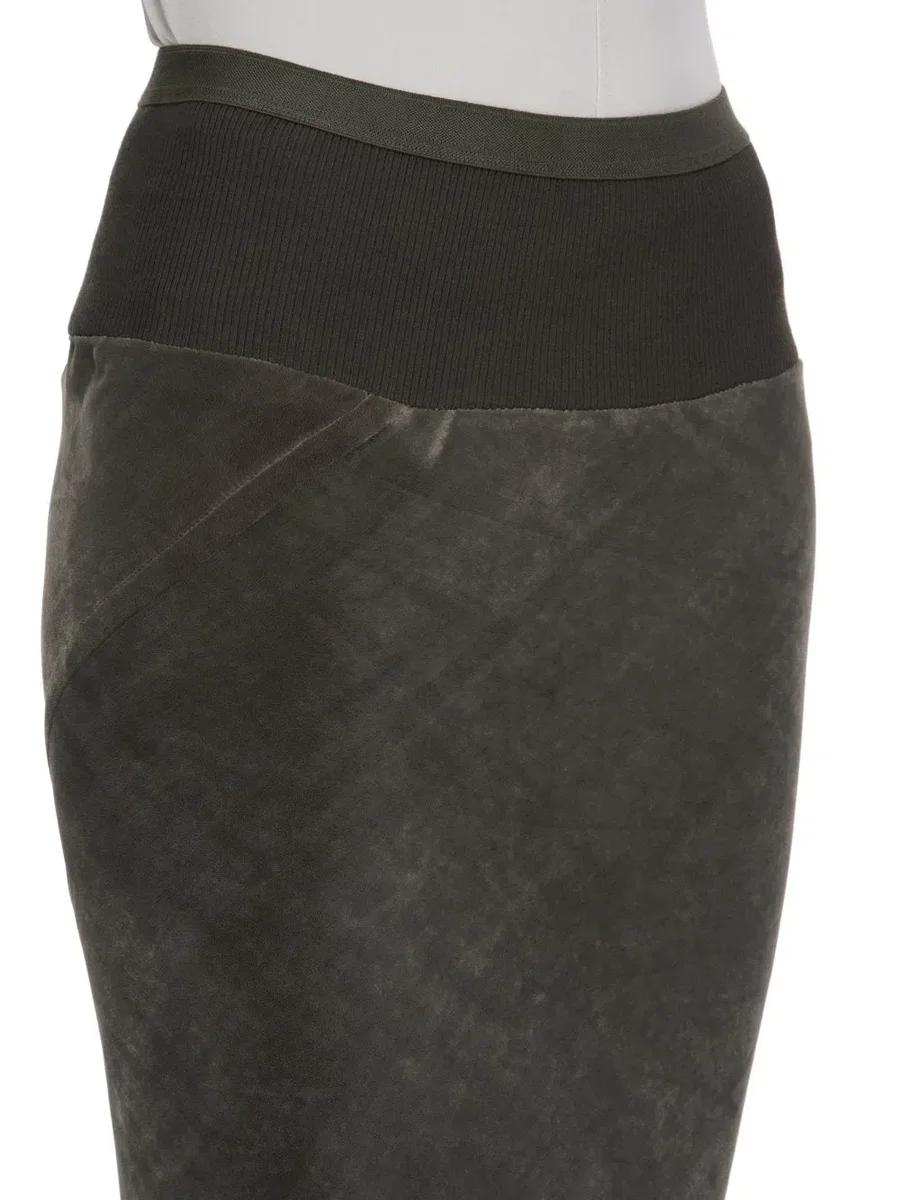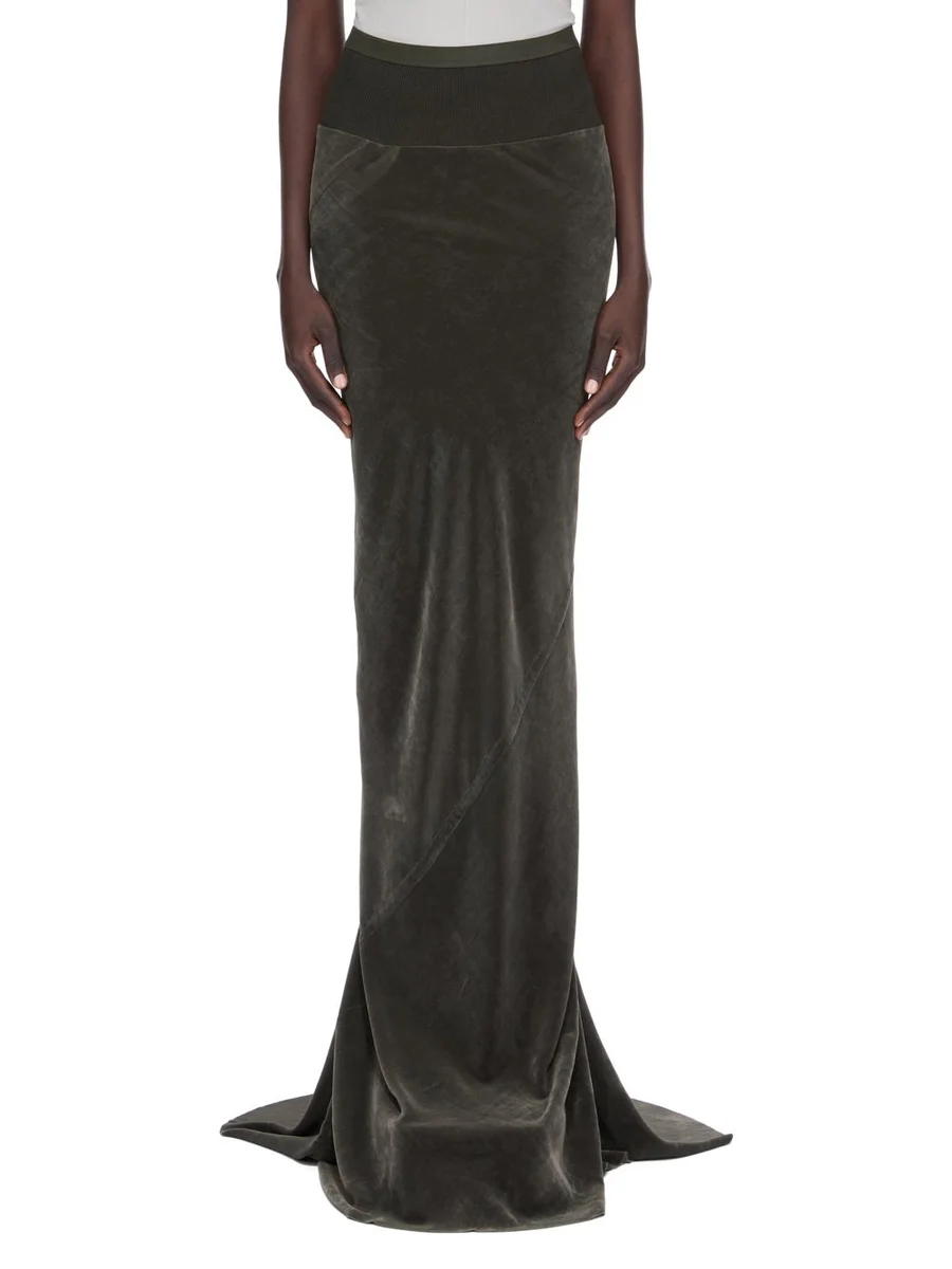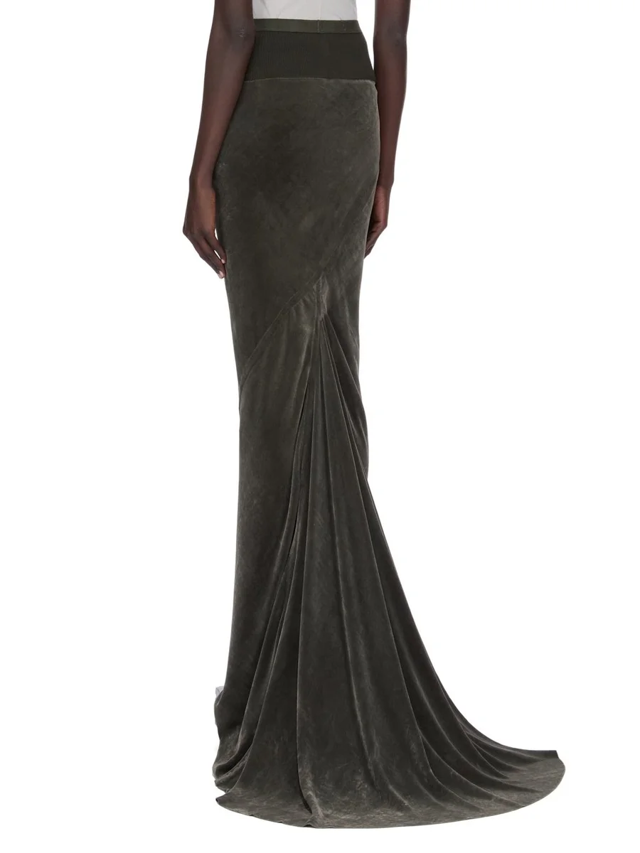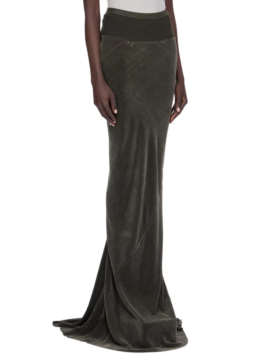 THIS SLIM LONG CODA SKIRT IS FLOOR LENGTH WITH A WIDE RIBBING AND ELASTICIZED WAISTBAND. IT FALLS IN A SLIM COLUMN TO THE FLOOR AND FEATURES A DIAGONAL BIAS CUT SEAM WITH DRAPED INSERT AT MID BACK.