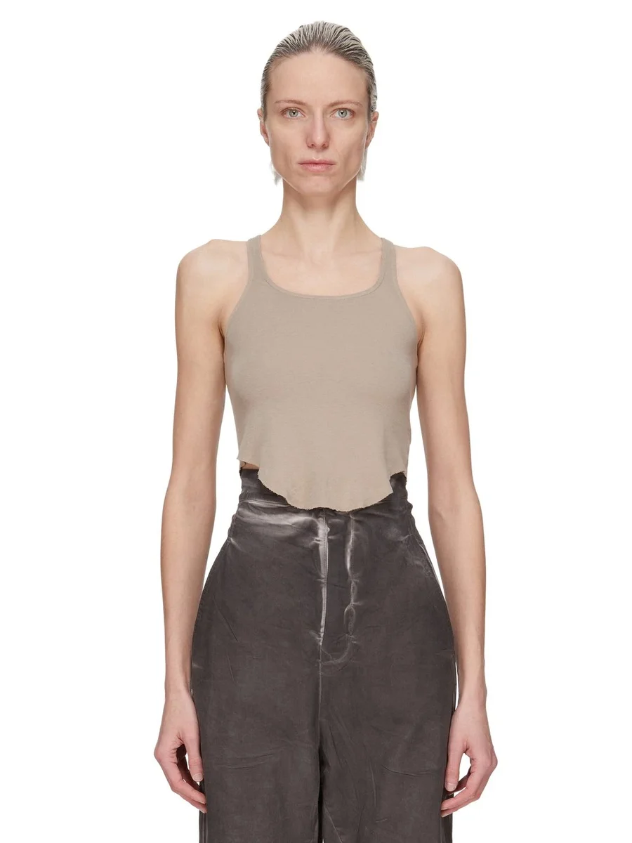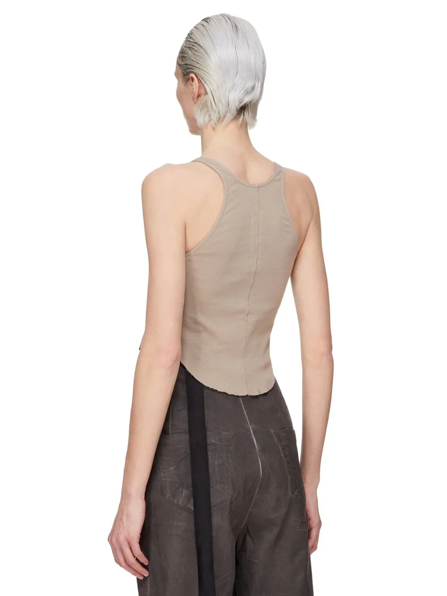 THIS BASIC RIB TANK IS ABOVE WAIST LENGTH WITH A ROUNDED RAW CUT HEM THAT DIPS IN FRONT AND BACK. IT HAS A ROUND NECKLINE AND THIN SHOULDER STRAPS THAT FLOW INTO A SLIGHT RACER BACK. ITS BACK IS SLIGHTLY LOWER THAN THE FRONT. IT FEATURES THE SIGNATURE SINGLE SEAM RUNNING DOWN THE CENTRE BACK SPINE.