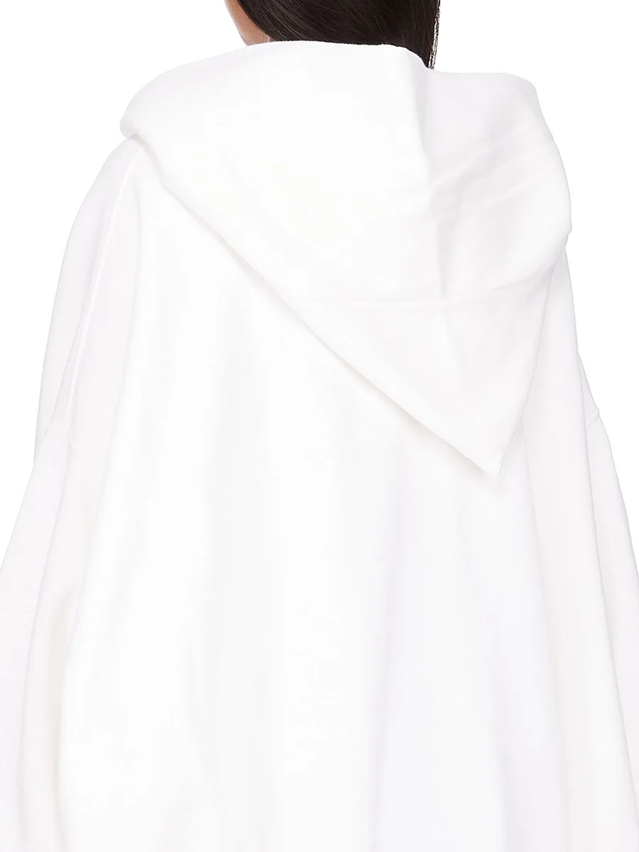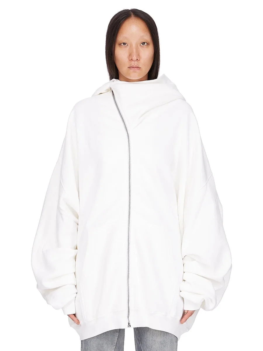 THIS MEGAMOUNTAIN IS BELOW HIP LENGTH WITH LONG SLEEVES AND MEGA OVERSIZED. IT HAS A CURVED ASYMMETRICAL ZIPPER CLOSURE, A SMALL FUNNEL NECK AND A LARGE POINTED HOOD. IT HAS TWO FRONT PATCH POCKETS, AND RIBBED CUFFS AND WAISTBAND.