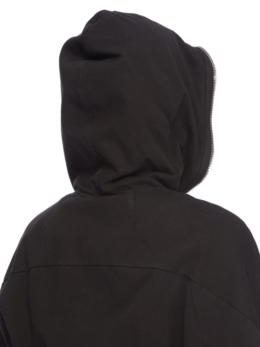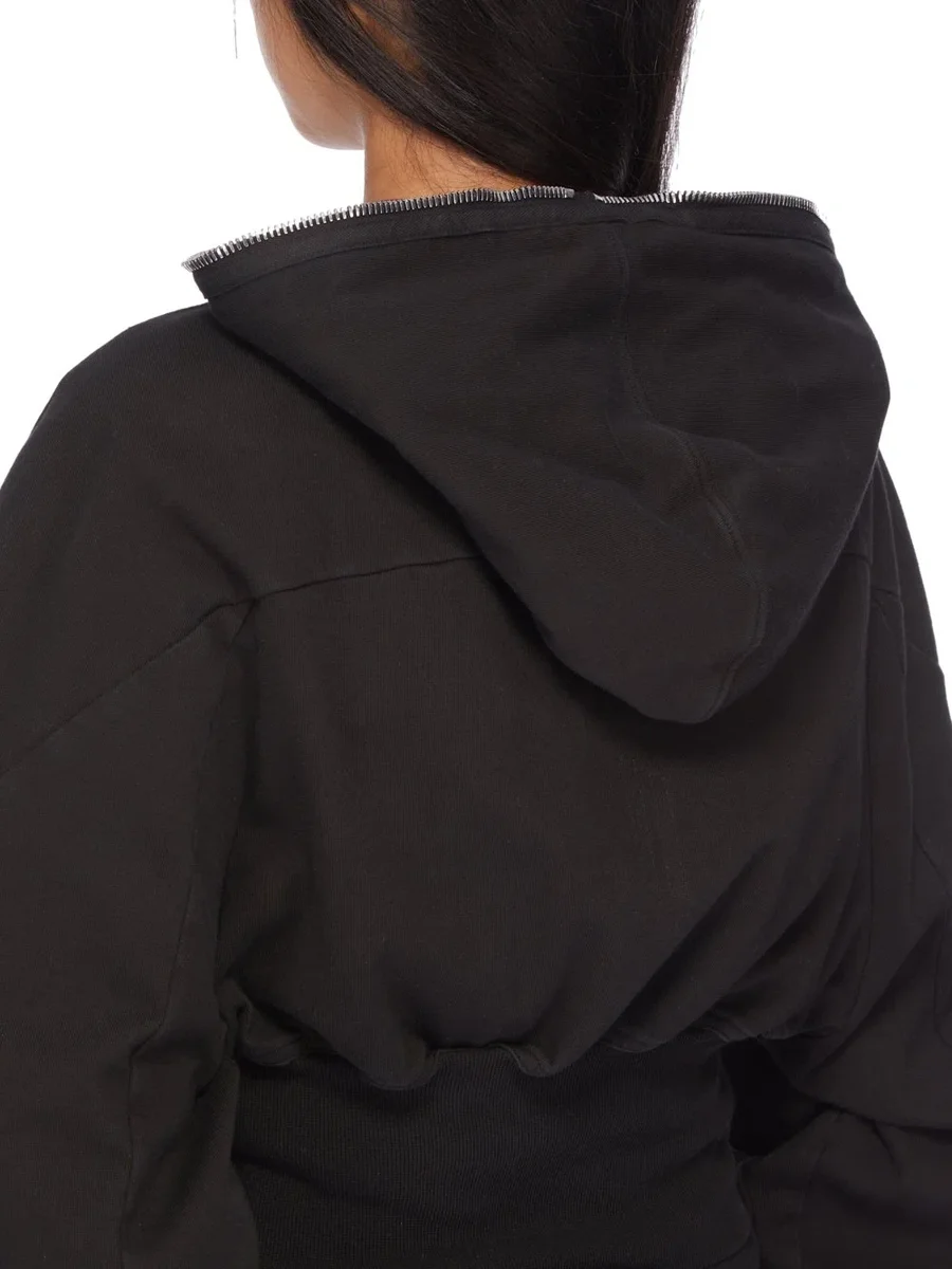 THIS COLLAGE GIMP HOODIE IS CROPPED WAIST LENGTH AND HAS LONG SLEEVES. IT HAS A FRONT ZIPPER CLOSURE WITH EXPOSED ZIPPER TAPE THAT RUNS FROM THE HEM ALL THE WAY UP THROUGH THE HOOD, ALLOWING IT TO BE ZIPPERED COMPLETELY CLOSED OVER THE FACE. IT FEATURES GEOMETRIC GIRDERED SHOULDERS AND STITCHING, A FRONT AND BACK YOKE AND HAS RIBBED CUFFS AND WIDE WAISTBAND.