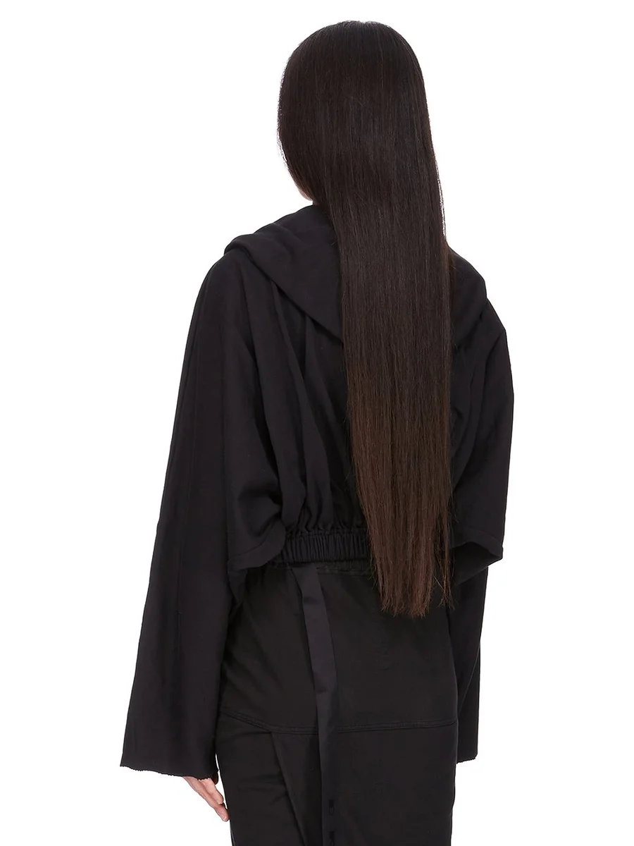THIS CROPPED HOODED TUNIC IS WAIST LENGTH WITH LONG SLEEVES. IT HAS A LARGE HOOD AND HIGH NECK. IT FEATURES WIDE, SUPPLE, SLEEVES AND A BODY THAT GATHERS AT THE RIBBED WAISTBAND, CREATING ELEGANT DRAPING. IT HAS A LINE RUNNING DOWN THE CENTRE BACK SPINE AND A CENTRE FRONT SEAM.