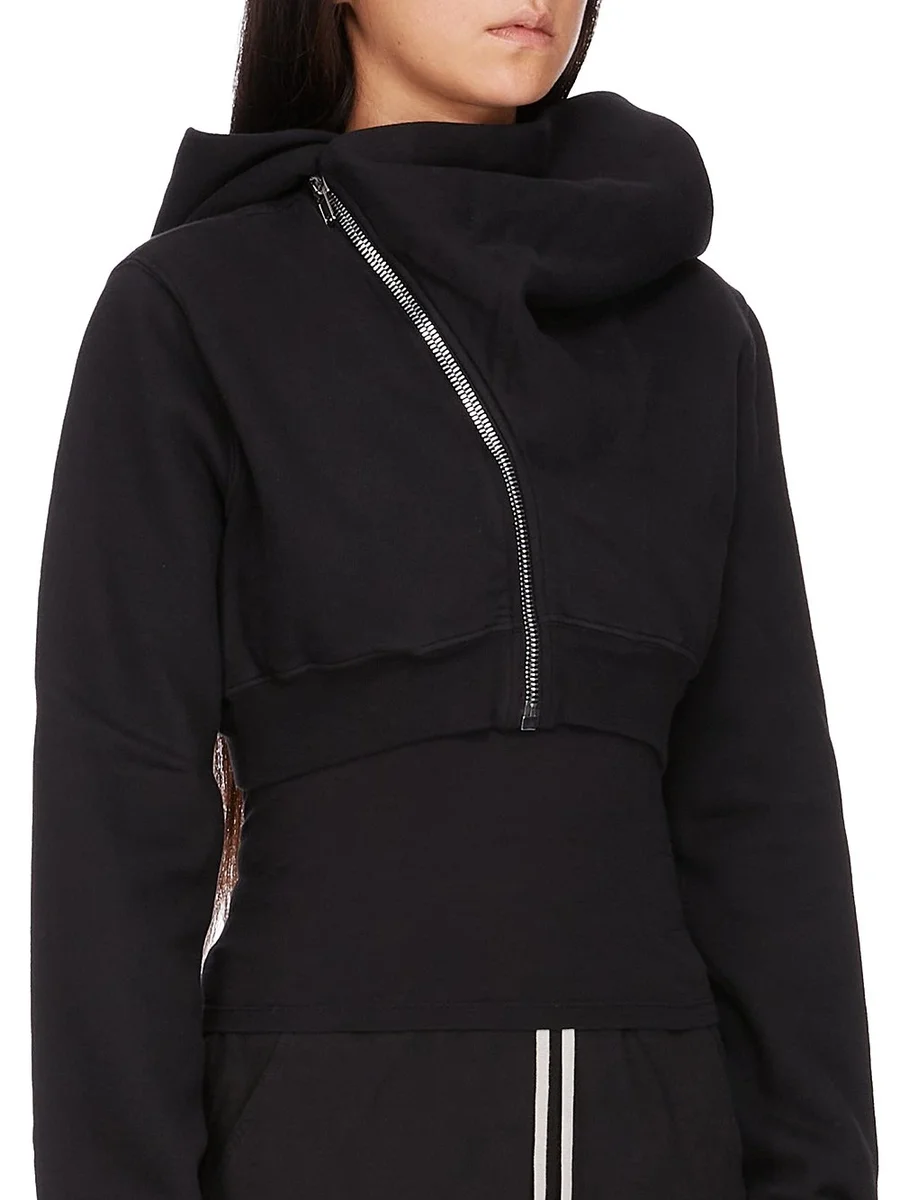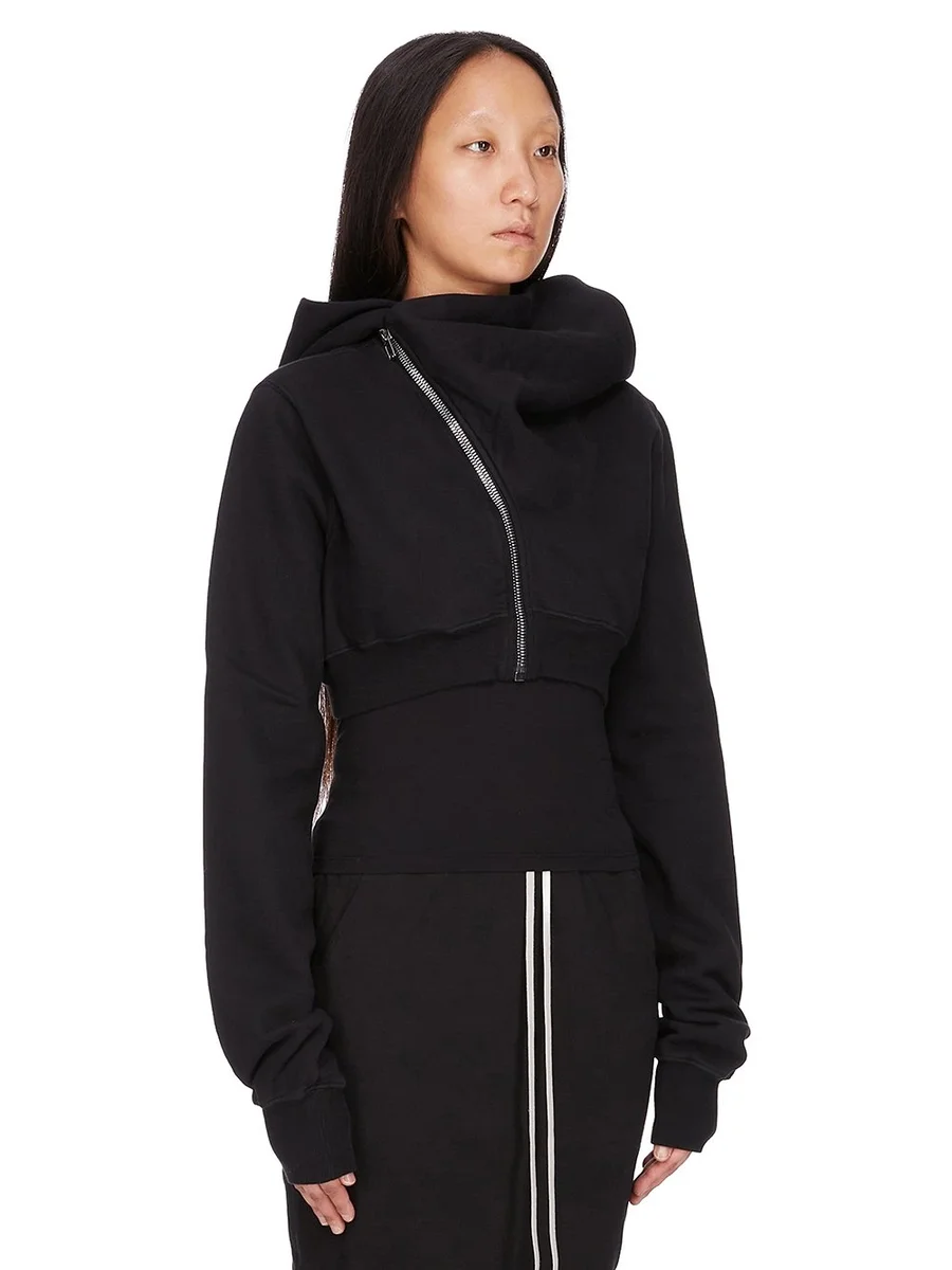 THIS MICRO MOUNTAIN HOODIE IS ABOVE WAIST LENGTH WITH LONG SLEEVES. IT HAS A CURVED ASYMMETRICAL ZIPPER CLOSURE, A SMALL FUNNEL NECK AND A LARGE POINTED HOOD. IT HAS RIBBED CUFFS AND WAISTBAND SIGNATURE SINGLE SEAM RUNNING DOWN THE CENTRE BACK SPINE.
