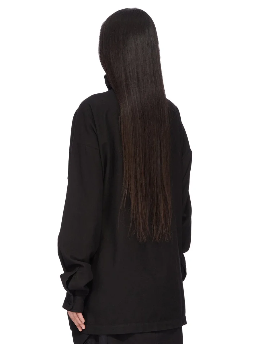 THIS JUMBO SHIRT IS BELOW HIP LENGTH WITH A JUMBO BOXY FIT. IT HAS LONG SLEEVES WITH BUTTON CUFFS, AND LOW SHOULDER SEAMS. IT FEATURES A HIGH COLLAR WITH A CENTRE BACK OPENING WITH BUTTON CLOSURES.