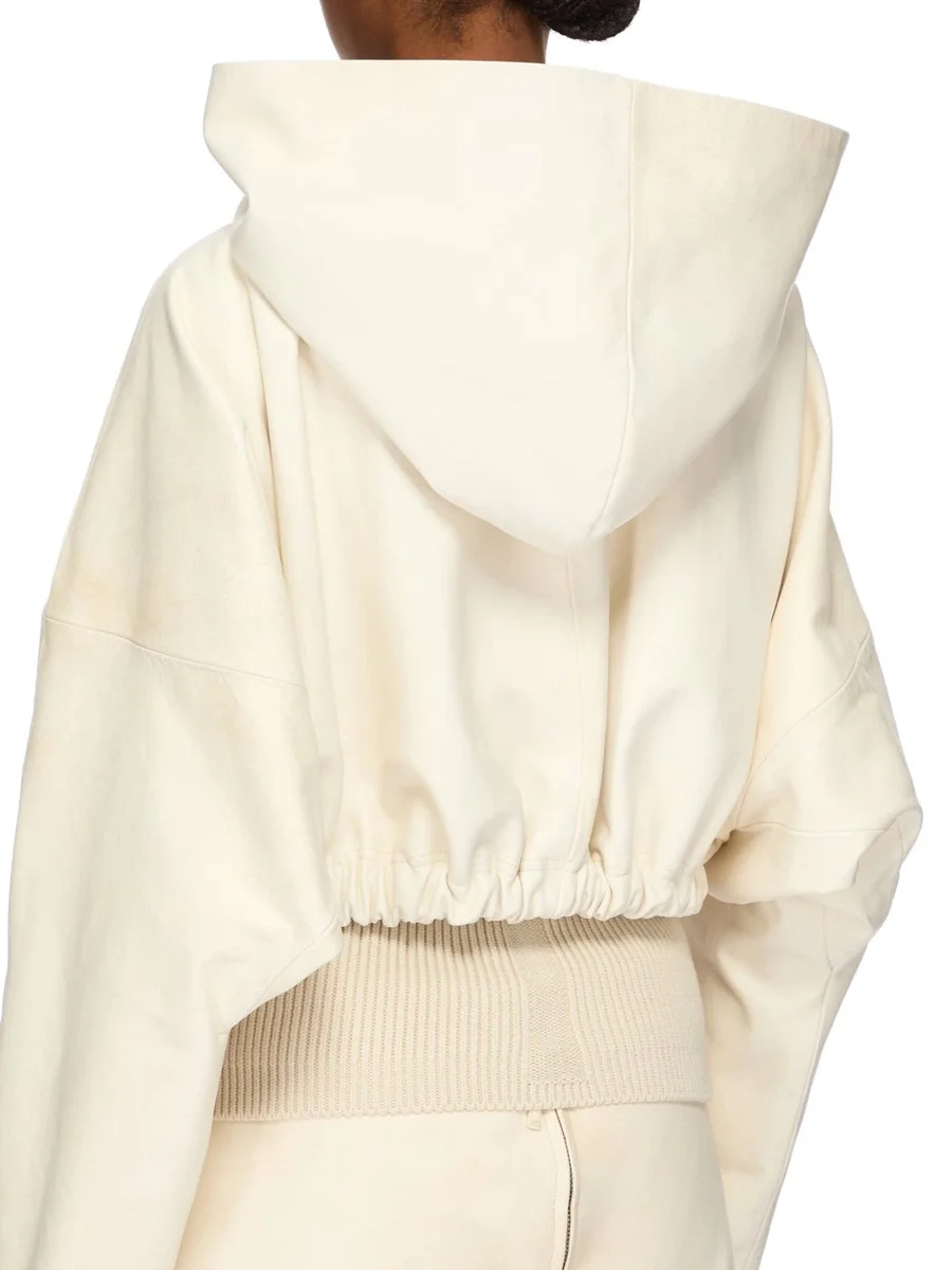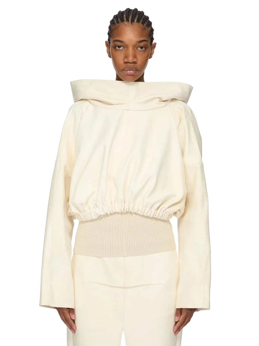 RICK OWENS FW25 CONCORDIANS RUNWAY CROPPED HOODED TUNIC IN MILK ALBINO LAMB LEATHER