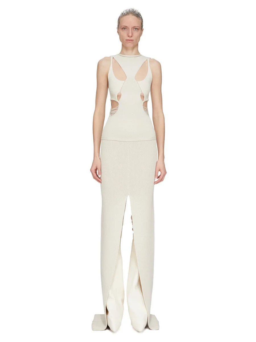 THIS TANJA TOP IS HIP LENGTH. IT HAS A ROLLED ROUND NECK AND IS SLEEVELESS. IT FEATURES CUT-OUTS ON FRONT CHEST, LOW BUST AND WAIST, WITH A SLIGHTLY SHREDDED SIDE AND A FULL BACK.