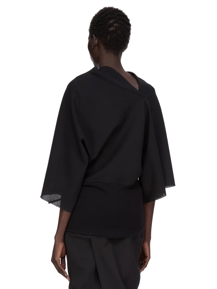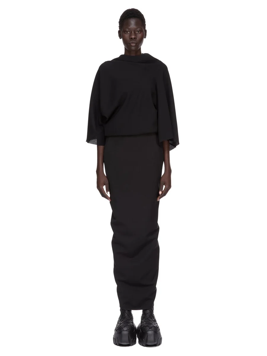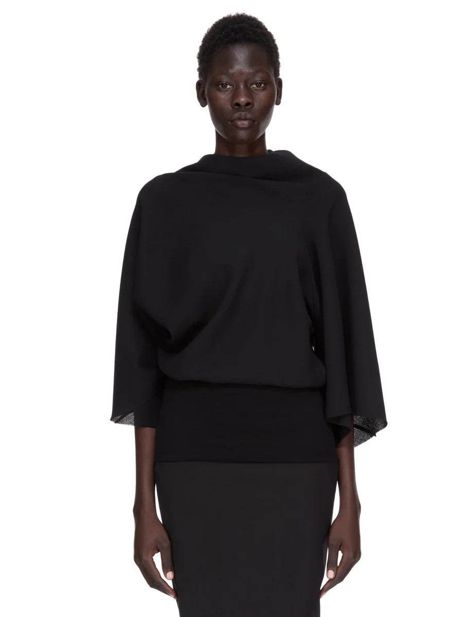 THIS CYLINDER TOP IS HIP-LENGTH, WITH A DRAPED BIAS CUT BODY, ELBOW-LENGTH WIDE SLEEVES AND A HIGH DRAPED COWL NECK THAT HAS AN ASYMMETRICAL OPENING AT BACK. IT GATHERS INTO THE WAIST AND FINISHES IN A TIGHT BODY TO THE HIP.