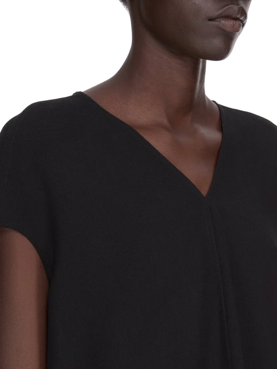 THIS FLOATING TOP IS HIP LENGTH WITH A VOLUMINOUS FIT. IT HAS WIDE SHOULDERS WHICH FALL INTO SOFT CAP SLEEVES, A V NECK AND CENTRE FRONT SEAM, AND ROUNDED BACK WITH DARTS AND A CENTRE BACK SEAM.