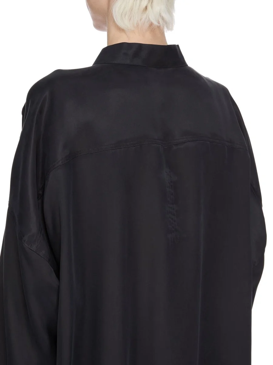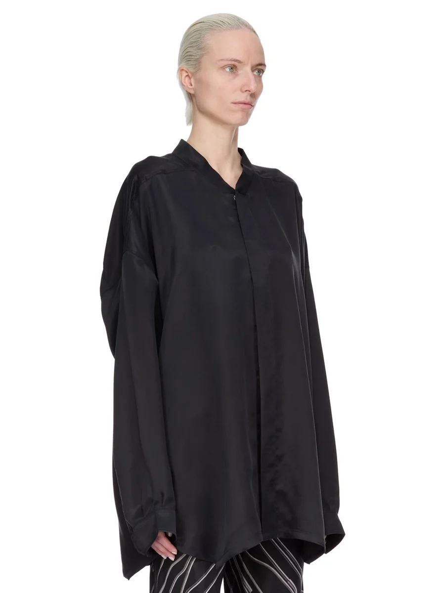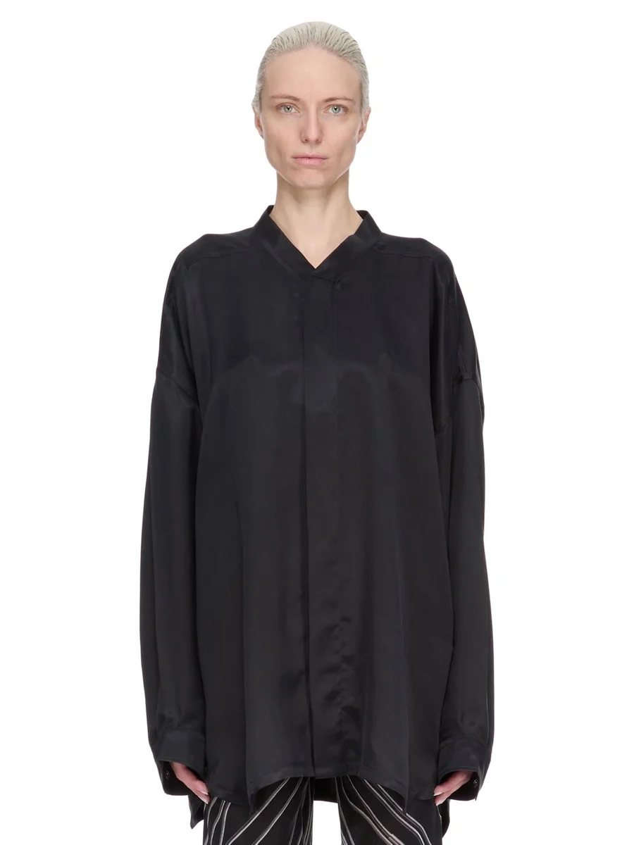 THIS JUMBO FAUN MINI IS BELOW-HIP LENGTH WITH LONG SLEEVES AND AN OVERSIZED. IT HAS A CENTRE FRONT OPENING WITH CONCEALED SNAP CLOSURES, A SLIGHT V NECK WITH FLAT COLLAR, AND SNAP CUFFS. IT FEATURES LEVEL SHOULDER SEAMS, BACK YOKE AND A HEMLINE WITH BEVELED SIDES.