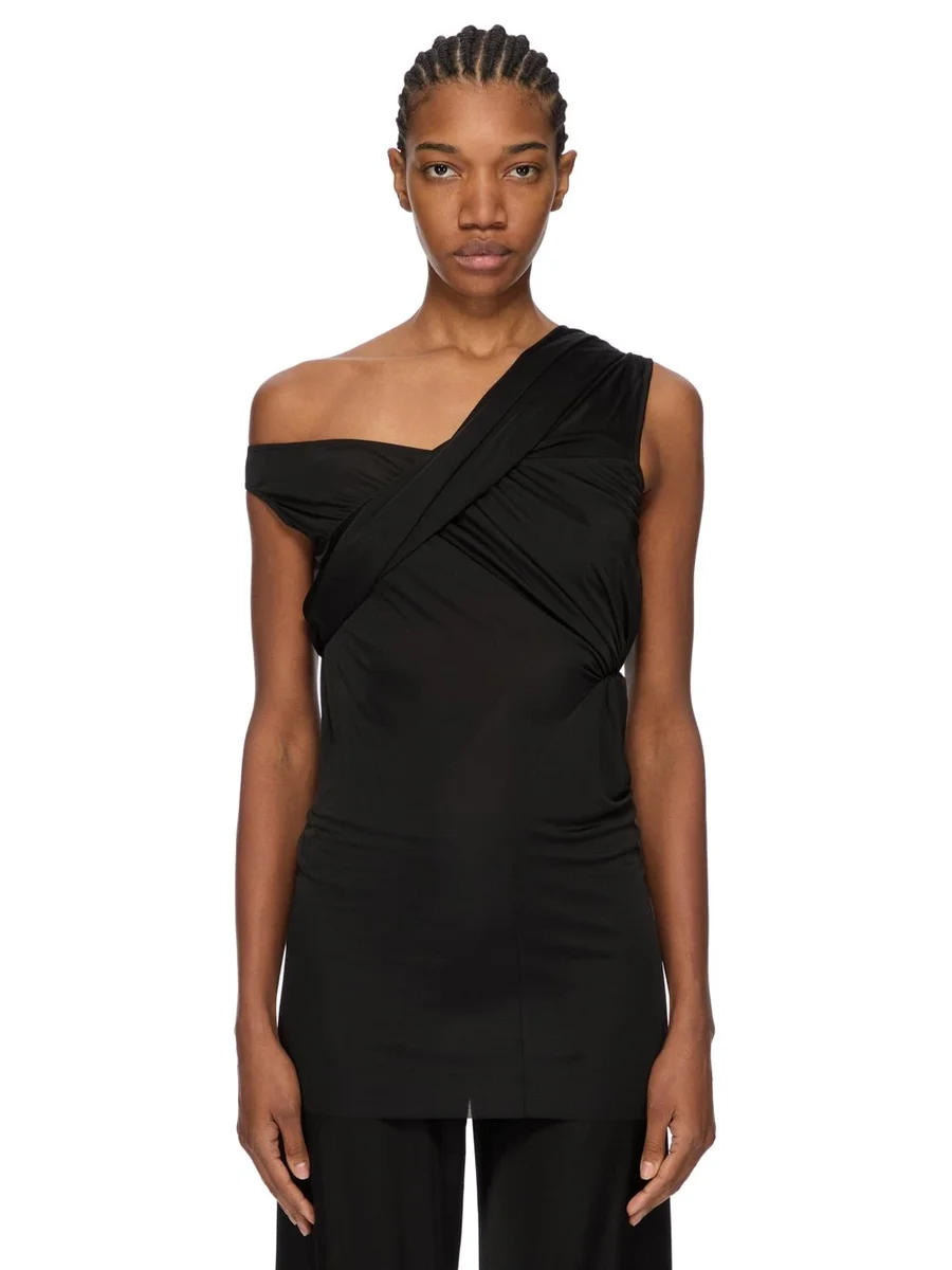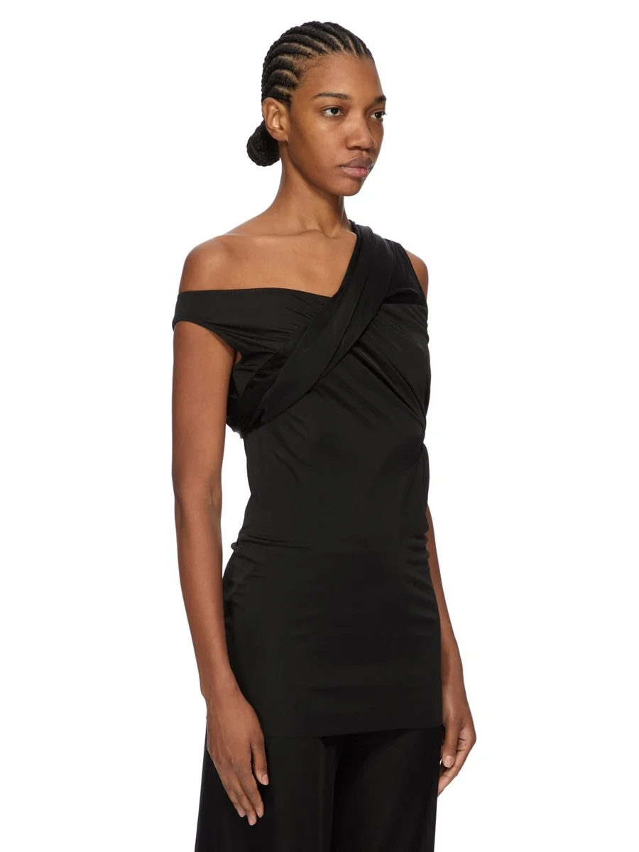 RICK OWENS FW25 CONCORDIANS SAHARA TOP IN BLACK SATIN VISCOSE JERSEY